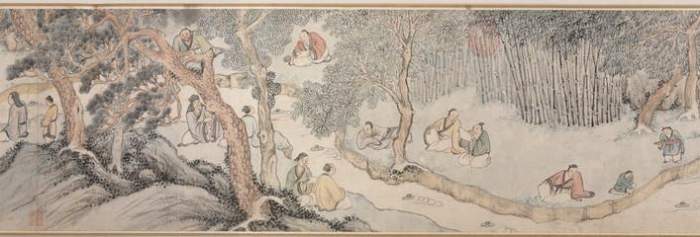文人不喜欢角逐体力,他们好风雅,喜欢迂回曲折、曼妙婉转的文娱活动,于是就有了诗情画意的修禊。修禊原为消灾祈福的仪式,农历三月初,人们成群结队到水边嬉戏,祈祷消灾除祸。后来,修禊发展为文人雅集的经典范式,尤其深得魏晋文人的喜爱。东晋永和九年(353年)三月三日,王羲之和当时名士孙绰、谢安等四十余人,宴集于会稽郡(今绍兴)兰亭,共修禊事。名士们列坐在蜿蜒曲折的溪水旁,将酒杯置于溪中,顺流而下,酒杯停留在谁面前,谁就得赋诗,赋诗不出者,罚酒三杯,这便是修禊的戏中之戏,称为“流觞曲水”。名士们群贤毕至,少长成集。衔觞赋诗,乐不知返。最后,大家把当场创作的三十七首诗作编辑成《兰亭诗集》,风行一时。而王羲之倾力为这次盛会创作和书写的《兰亭集序》,文采斐然,独步天下,成了中国文学史和书法史上的绝世瑰宝。