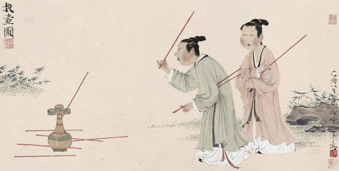 春秋战国时期,诸侯争雄,崇尚精骑善射的武士精神。以角逐射术为特点的投壶,成了广受欢迎的游戏。投壶最初源于礼仪,郑玄所注《礼记正义》说:“投壶者,主人与客燕饮,讲论才艺之礼也。”当时,成人男子以善射为荣,诸侯聚会,往往邀请宾客射箭。然而,有的宾客不会射箭,只好以箭投酒壶代替。因此,投壶慢慢发展成了宴饮游戏。投壶时,主宾对坐,以酒壶为器皿,人与壶相距数尺,以去掉箭头的箭投掷,中壶者得胜。左丘明《左传·昭公十二年》记载,晋昭公即位时,周王室及诸侯前来祝贺。晋昭公与齐景公比试投壶、二人在投壶过程中唇枪舌剑,争为诸侯之首,结果不欢而散。可见,宫廷中的游戏,有时不仅仅是游戏,还是政治。