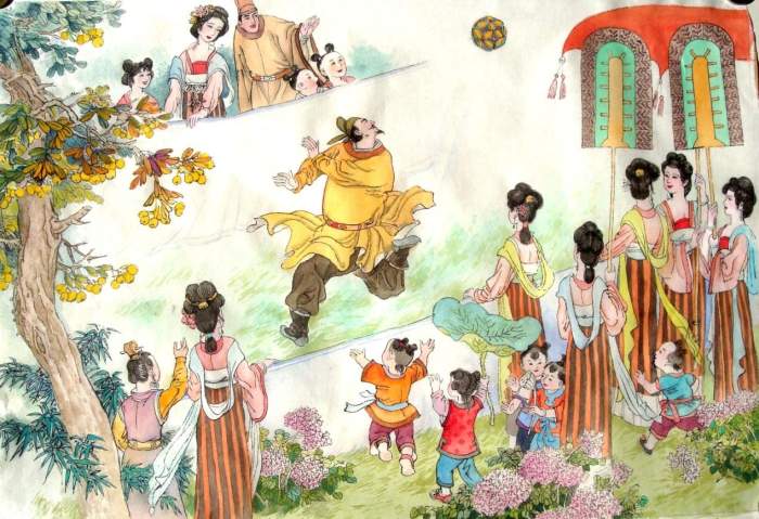 唐宋之际,最流行的娱乐活动,恐怕非蹴鞠莫属。蹴鞠的流行之下,鞠的形制也不断发展。从文献记载来看,当时已用灌气的球代替过去用毛发充塞的球。毛维诗云:“蹴鞠屡过飞鸟上,秋千竞出垂杨里”;杜甫也说:“十年蹴鞠将雏远,万里秋千习俗同”,足见蹴鞠受欢迎的程度,堪称全民娱乐。宋代高俅,曾因擅长蹴鞠而一步登天。据王明清《挥尘录》记载,高俅本是驸马都尉王诜的小吏。一次,王诜让高俅去端王府送东西,恰遇端王玩蹴鞠,端王邀高俅一起玩。高俅乃蹴鞠高手,伸腿便踢了个满堂喝彩,让端王刮目相看,随即把他留在了身边,视为心腹。后来,端王继位为宋徽宗,高俅因此扶摇直上,官至太尉。