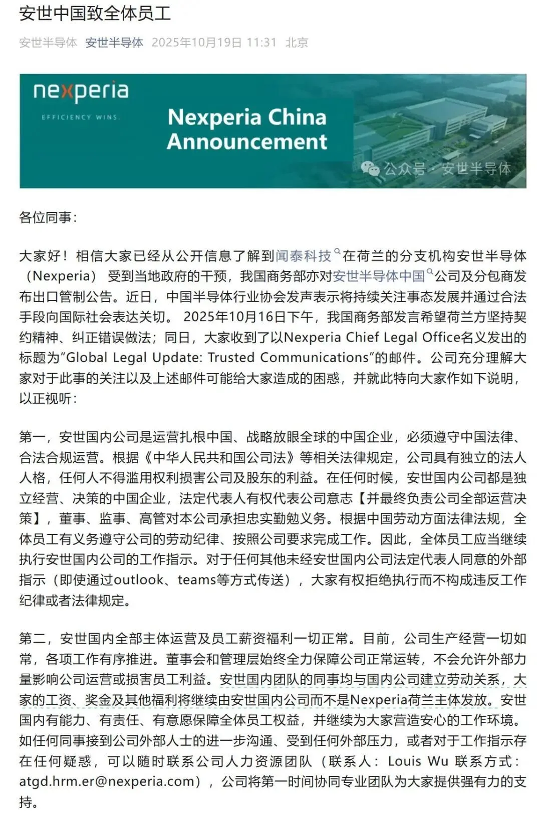 10月17日,安世中国员工账号遭荷兰总部封禁。闻泰科技回应称,为应对欧洲可能切断系统与资金的风险,中国区正推进独立自救,拉通国内供应链以保障客户供应。10月19日,安世中国发公开信安抚员工:国内主体运营及薪资福利均正常,生产经营有序推进;明确国内公司为独立中国企业,员工应执行国内公司指令,有权拒绝未经法定代表人同意的外部指示,且薪资等由国内公司发放,不受荷兰主体影响。 随着美国与中国不断强化的供应链冲突和角力,也因为欧洲希望利用中美冲突,同时又想避免自己受损,很多企业的经营环境面临新挑战,自主性受到地缘政治冲击,一些政府和企业都可能在茫然中拥抱短期目标,行动走形。荷兰以粗暴方式控制商业公司安世半导体,就属于典型的机会主义胡来。 安世半导体被闻泰科技收购后,它的资源得到了更加优化的配置,前途更被看好,但是现在却深深掉入地缘政治和意识形态漩涡。安世会受到美国制裁的多大影响,这本来是这家商业公司自己更操心的事情,但是现在荷兰政府却直接插手接管该公司,搞出针对该公司的“政变”,又想讨好美国,又操心该公司的技术和知识产权可能转移到中国,这些都是彻头彻尾的政治。