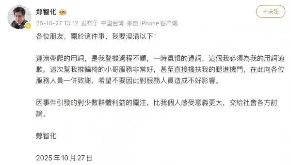 文/九派新闻评论员 文和刀 “就事论事,有则改之,无则加勉。一个对于残障人士来说更加友好的未来,需要残障人士的主动表达,也需要我们的共同努力。” 10月25日下午,歌手郑智化在微博发文“吐槽”深圳机场服务冷漠,其声称自己登机时,因升降车停离机门地板25cm,轮椅推不进飞机,只能连滚带爬进飞机。这一发声迅速引发网络热议,进一步引发了对于残疾人服务保障的更多讨论。 当晚,深圳机场公开致歉,承诺联合航司立行立改,全面审视并优化特殊旅客的服务保障细节。一些细节得到进一步披露:一方面,为解决该乘客登机困难的问题,机场派出了1名航司地服人员和1名机组人员协助;另一方面,根据安全操作规范,登机车与飞机舱门必须保持20cm的高度差,这是为了防止保障设备刮碰飞机,而并非出于操作人员的冷漠。 10月27日午间,郑智化发文澄清提到:“连滚带爬的用词,是我登机过程不顺,一时气愤的遣词,这个我必须为我的用词道歉,这次帮我推轮椅的小哥服务非常好,甚至直接搀扶我的腿进机门,在此向各位服务人员一并致谢,希望不要因此对服务人员造成不好影响。”