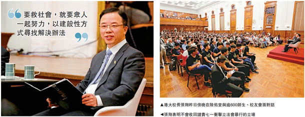 7月18日傍晚,香港大学校长张翔在港大陆佑堂与学生会面对话,逾600师生、校友参与。