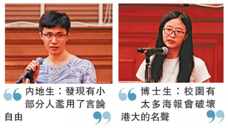 连日来所谓的“民主墙”出现不少粗口、侮辱性言论,甚至有人被起底,有学生在对谈会亦批评校园的海报会破坏港大的名声。港大校长张翔重申,他欣赏表达意见的人,强调自己的工作亦是维持言论自由,但对有人用粗口感到不快,重申表达自由不应用带有仇恨的言语,亦要小心处理仇恨言论,形容粗口标语“令人厌恶”(disgusting)。