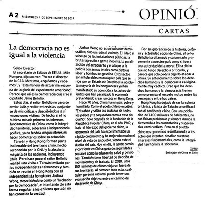 据外交部官网消息,2019年9月4日,驻智利大使徐步在智最大报纸《信使报》发表署名文章《民主不等于暴力——贝略里奥对人权民主的理解在逻辑思维上很混乱》,严辞批驳智利众议员贝略里奥涉港言论。 8月25日,《信使报》刊登贝略里奥会见“港独”暴力分子黄之锋的消息并配发照片。9月1日,徐步大使在《信使报》发表文章,揭露乱港暴力分子的真相,批评贝的错误言行。贝连日来为自己辩解,并一再攻击中国。 徐大使在4日《信使报》文章中指出,台湾和香港是中国领土不可分割的一部分,这得到联合国和包括智利在内的世界上绝大多数国家承认。贝不久前应“台独”分子邀请去了趟台湾,在香港又见了“港独”分子黄之锋,把黄之锋描述成一个民主斗士。他这么说是在欺骗不明真相的智利民众。徐大使强调,贝略里奥对中国的历史、文化、社会现状十分无知。他对人权民主的理解,在逻辑思维上很混乱。 全文翻译如下: 来源:外交部官网 美国国务卿蓬佩奥今年早些时候曾说:“我们(中情局)撒谎,欺骗,偷窃,这些是美国不断探索的荣耀。”很显然,贝略里奥众议员相信这就是民主。 这些天贝略里奥发了不少推特,接受了不少采访。他抱怨我批评他,把自己描绘成一个受害者。事实上,如果不是他首先严重侵犯中国的领土完整和主权独立等核心利益,我根本没有兴趣去评论他的表演。 台湾和香港是中国领土不可分割的一部分。这得到联合国和包括智利在内的世界上绝大多数国家承认。但是,贝略里奥不久前应“台独”分子邀请去了趟台湾。不仅如此,他在香港又见了“港独”分子黄之锋,把黄之锋描述成一个民主斗士。他这么说是在欺骗不明真相的智利民众。 黄之锋不是民主分子,而是暴力分子。他带头破坏公共设施,虐打公众,阻滞交通,瘫痪机场,用激光枪、汽油弹等致命武器袭击警察。这些作为在任何法治国家都不会被允许。香港经济已经停滞,绝大多数香港民众反对暴力乱港行为。 70年前,中国是个贫穷、被欺侮的国家。智利诗人聂鲁达写道,西方人“出出进进抢劫中国,好像走进一所没有主人的房屋。”1949年新中国成立后,在中国政府领导下,中国经济快速发展,人民生活水平不断提高,真正成为国家的主人。如今中国普通百姓都享有教育、医疗、养老等保障,也都享有选举、迁徙和择业的自由。2018年中国出境旅游达1.5亿人次。每个理性的人都会对中国的发展道路做出客观评价。 贝略里奥对中国的历史、文化、社会现状十分无知。他大肆污蔑中国,把自己描绘成是道德圣人。他说我无权批评他,似乎只能任由他攻击中国。他对人权民主的理解,在逻辑思维上很混乱。我认为,人权及民主的前提是人与人、国与国之间的相互尊重。 香港已不是英国的殖民地,台湾终将实现与大陆的统一。中国有14亿人,我们不缺少问题,我们欢迎建设性的意见。但是,中国人民坚决反对任何挑战中国领土主权等核心利益的行为。 |