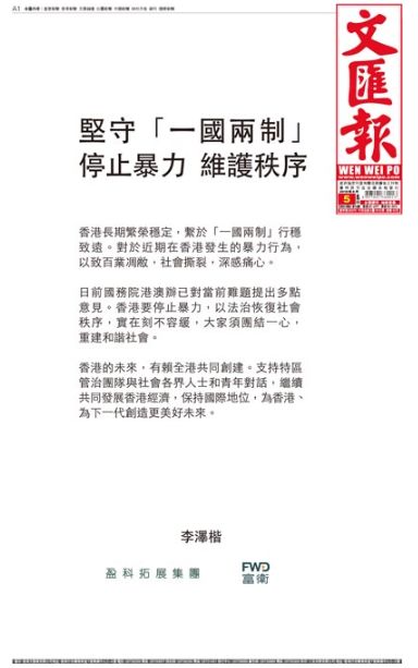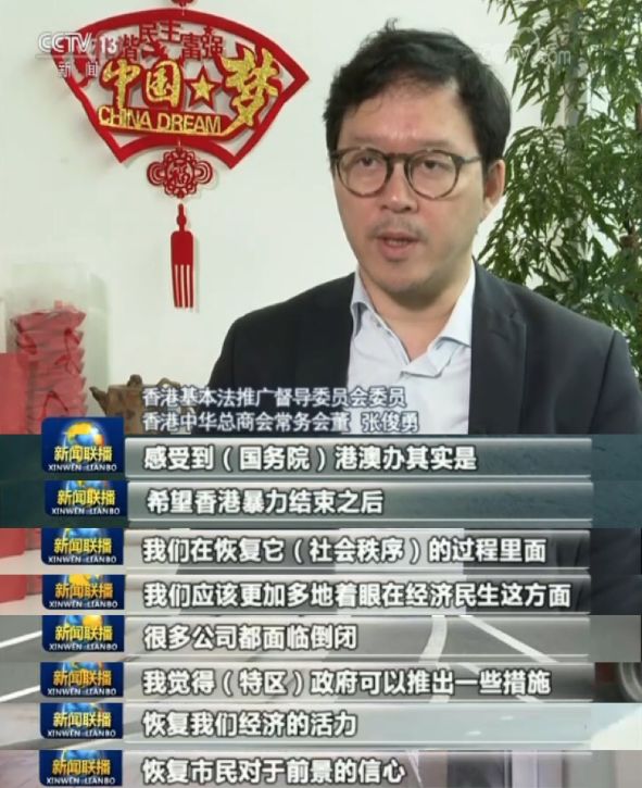 香港9月5日发生了什么?一文速览↓ 9月5日内容提要 △ 香港各界呼吁尽快恢复经济活力 乘着大湾区的势头 年轻人有大把机会! △ 香港元朗区议会通过止暴议案 △ 有刑事案底极大影响前程 律师告诫香港年轻人:停止犯法 △ 香港百年古迹惨遭喷墨涂污 网友痛批:毫无操守 耻与为伍! △ 驻 港部队加入 # 我和国旗同框 # 活动 网友: 22 年,感谢有你! △ 厌恶暴力 全民撑警:香港阿Sir,我哋撑你! 香港各界呼吁尽快恢复经济活力 乘着大湾区的势头 年轻人有大把机会! 香港各界人士表示,香港社会的深层次矛盾和问题必须得到高度重视和有效解决。现在亟需恢复香港经济活力,香港市民表示,希望乘着大湾区的势头,融入中国内地的发展。 香港基本法推广督导委员会委员、香港中华总商会常务会董张俊勇表示,已经有很多公司面临倒闭或者已经倒闭了, 他认为现在应该更多地着眼于香港经济的恢复,市民对于前景的信心恢复。 香港市民张仲衡也表示很希望香港可以乘着大湾区的势头,融入中国内地的发展,真真正正同全世界讲,我们是中国人,我们是中国的香港人。 香港元朗区通过止暴议案 元朗区议会议员日前提出动议,支持警方依法止暴制乱,并强烈要求政府立即采取有效措施,尽快平息动乱,恢复社会秩序,避免市民受伤甚至丧命。 该动议强烈要求政府:全力支持监警会彻查对警察的各项指控;责成警方成立项目小组,缉拿在元朗多次暴力事件中的违法者;尽快成立对话平台,与社会各界真诚沟通;以及委任以学者为主的专责小组,广泛接触社会各持份者,针对香港社会深层次矛盾进行专题研究,并向政府提出建议。 最终,该动议3日以23票支持、6票反对及1票弃权通过。 元朗区议会也成为全港18区第一个通过止暴制乱动议的区议会。 有刑事案底极大影响前程 律师告诫香港年轻人: 停止犯法 国务院港澳办3日表示在止暴制乱、关乎香港前途命运的问题上,没有中间地带,容不得犹豫,并提出三点意见。如何理解这三点意见?央视记者专访了香港法学交流基金会主席、大律师马恩国。 马恩国表示,暴乱的骨干分子主要是在前线扔砖头、放火、袭警的暴徒。在香港现行法律里, 关于暴动罪以及任何协助、教唆、怂使暴动罪的共犯,最高刑罚都是十年监禁。 而非法集会可被定罪为非法集结罪,最高刑罚三到五年监禁。 非法集结之后如果使用了暴力,比如摧毁财物,就涉嫌刑事毁坏,最高刑罚是终身监禁。 马恩国还指出,年轻人很容易被人煽动。特别是一些有心的媒体,有心的外国势力想煽动这些年轻人反对中央政府。很多年轻人不知道犯罪后果,如果真的坐牢,将来读多少书都没用。 香港警方回应葵涌警察被袭案 8月30日,葵涌警署一名45岁枪房男警深夜下班后,途经葵芳巴士总站附近时遭三名男子 伏击,警员手、脚及背遭受至少三刀重创。 在5日的港警记者会上,组织罪案及三合会调查科高级警司李桂华表示,受伤警员仍于深切治疗部留医。 香港百年古迹惨遭喷墨涂污 网友痛批: 毫无操守 耻与为伍! 近日,位于香港上环的城皇街花岗岩石阶被黑色油漆喷涂一事引发关注。该段石阶属于“孙中山史迹径”的一部分。现场可以看到,被喷污的石阶有11级,除了台阶,附近的大理石花盆和墙面也被喷污。有网友心痛狠批:毫无操守 耻与为伍! 李泽楷发声明: 支持政府与各界对话 盈科拓展集团主席、李嘉诚次子李泽楷,5日在多份报章刊登声明,呼吁坚守“一国两制”,停止暴力,维护秩序,他特别声明支持特区政府管治团队与社会各界人士和青年对话。 李泽楷在声明中指出,香港长期繁荣稳定,系于“一国两制”行稳致远,对于近期在香港发生的暴力行为,以致百业凋敝,社会撕裂,深感痛心。他说,国务院港澳办日前已经对香港当前难题提出多点意见,香港要停止暴力,以法治恢复社会秩序,实在刻不容缓,大家要团结一心,重建和谐社会。他还表示 支持特区政府管治团队与社会各界人士和青年对话,继续共同发展香港经济,保持国际地位,为香港、为下一代创造更美好未来。 英国专家: 香港问题只能由中国人民自己解决 英国伦敦金融城前政策与资源委员会主席包墨凯曾多次到访香港和中国内地多个城市,对中国近些年来的迅猛发展印象深刻。 他表示,多年来,“一国两制”让香港和内地共同受益、共同发展,但香港近期发生的暴力违法事件如果继续下去,必将损害香港的全球金融中心地位。而香港问题只能由中国人民自己解决。 香港的士司机: 不要“手停口停”,为自己发声 司机谢师傅开了十多年的出租车。 现在,香港连游客最密集的尖沙咀都很难揽到客人。谢师傅不仅要面临生意冷清的困境,还要面临可能发生的暴力活动对自己人身安全的威胁。有句粤语叫“手停口停”,意思是不干活就没饭吃, 谢师傅说, 他不要“手停口停”,不要再沉默,要为自己发声,为香港带来正能量。 驻港部队加入“我和国旗同框”活动 网友: 22年,感谢有你! 由央视新闻新媒体中心发起的“我和国旗同框”活动,目前已经在北京、上海、南京、广州、深圳等地的地标以及重点高校举行多项活动。 8月11日,央视新闻在微博上发起#我和国旗同框#话题,引发大量网友的参与互动, 截至9月5日22时,#我和国旗同框#话题阅读量达8.7亿,17.1万网友参与话题讨论。 5日傍晚,@驻香港部队也参与话题并发布视频: 我们是@驻香港部