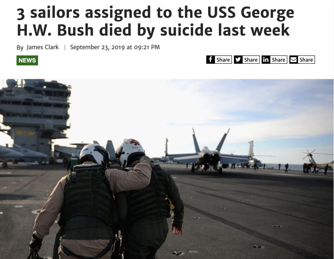 据美媒23日报道,美国海军宣布,美国海军“乔治·H·W·布什”号航空母舰(USS George H. W. Bush)的三名船员上周自杀身亡。 诺福克海军基地发言人詹妮弗·克拉格中校表示,首席电子技术员詹姆斯·谢尔顿(James Shelton)和伊桑·斯图尔特(Ethan Stuart)于9月19日分别在基地外地点被发现死亡。这两起死亡事件发生在美军航空兵文森特·福林(Vincent Forline)自杀身亡5天后。 克拉格说:“每一个船员的死亡都是毁灭性的,影响到我们整个海军家庭,我们向船员的家人、朋友和船友表示慰问和哀悼。”克拉格表示,没有一例死亡事件发生在这艘停靠在诺福克基地的航空母舰上。 周一晚间,美国“布什”号指挥官肖恩·贝利(Sean Bailey)上尉证实,最近的船员死亡事件标志着“过去两年中第三、第四和第五名船员自杀”。贝利称,“现在是时候像全体船员和家人一样,我们应该悲伤,互相支持,关心那些需要帮助的人。”他还指出,心理咨询和支持系统“随时可用,为悲痛的人们提供支持和咨询”,并鼓励船员“密切关注任何压力,当任何人面临重大的生活变化时,都会遇到这种压力,如:关系问题、个人或职业问题、最近的职业转变、财务困难、纪律或法律问题。” 在社交媒体脸书上的关注美军服役人员的一个账号“减慢你的生活”评论了船员自杀事件后,该事件在社交媒体上引起了广泛的关注。据不愿透露姓名的该账户负责人透露,已经收到了30至40名“布什”号船员的信息,他们声称,舰上领导层试图淡化最近的自杀事件,而且,航母上可能存在“有毒的指挥环境”,指出在航母停靠期间,存在工作时间长、压力过大和缺乏私人时间的问题。 “你永远不在家,你不能见家人,你不能见孩子,”账号管理员说,他声称自己在“布什”号服役近5年,在海军服役6年,那种环境压力很大。” 此外,账号管理员还表示,对最近的自杀事件发表评论后,他的账户暂时在“布什”号的官方脸书页面上被屏蔽。美国海军拒绝就账户被“拉黑”的原因发表评论。 据美国海军研究协会新闻报道,“海军报告称,截至2019年9月5日,有46名现役军人丧生。” 据《海军时报》报道,2018年,海军记录的现役海军中有68人自杀。 |