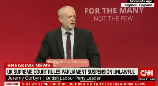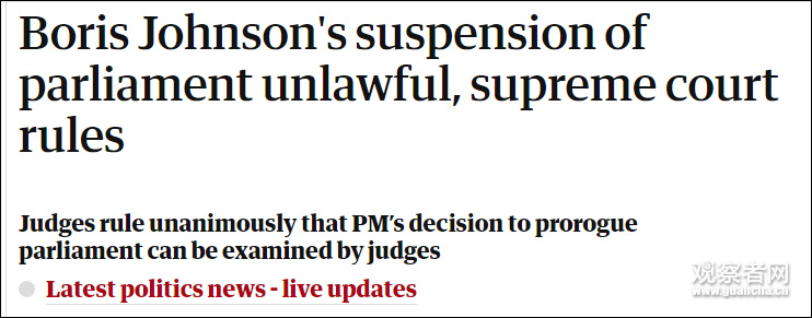就在刚刚(9月24日),英国最高法院今天一致裁定,该国首相鲍里斯•约翰逊请求女王伊丽莎白二世批准议会休会的行为,系违法。英国下议院议长随即表示,议会将立即结束休会。 BBC新闻网分析称,本次裁定对于鲍里斯•约翰逊来说是“最糟糕的结果”。至此,约翰逊上任以来的“三板斧”——提前大选、议会休会、“无协议脱欧”——均已失败。 在野党工党领袖科尔宾和苏格兰首席大臣斯特金随后表示,约翰逊应该下台。 约翰逊在英国议会外接受媒体采访时表示,英国政府将尊重最高法的裁定,但政府将确保议会有时间就“脱欧”进行表决,他还重申自己将在10月31日前带领英国“脱欧”。 据《卫报》24日消息,就英国议会休会是否合法一事,英国最高法院11名法官已于上周,就来自英格兰、苏格兰和北爱尔兰的三起上诉官司进为期3天的听证会。早前据观察者网报道,苏格兰最高法院已于9月11日裁定休会在法律层面不可行。 三名上诉法官认为,约翰逊作此决策,首先想“避免或阻碍议会就‘脱欧’事宜问责政府并立法”,其次想“允许政府在不受议会进一步干预的情形下推动‘无协议脱欧’”。政府随后向英国最高法院提起上诉,承诺尊重最终裁决。 最终,英国最高法院院长黑尔夫人(Lady Hale)今天宣布,最高法11名法官一致认为,英国议会休会不合法、且无效。裁定结果作出后,按流程将由英国上下两院议长决定下一步做法。 黑尔夫人宣布休会违法 图自独立报视频 下议院议长约翰•伯科随即对最高法裁定结果表示欢迎,并称议会“必须立刻重新召开”。 随后,据CNN新闻网消息,上议院议长诺曼·福勒也表示,将“尽快”和下议院一样重新召开议会。 在野党工党领袖科尔宾随后表示,要求约翰逊下台。他称英国首相之前的做法“是对民主的藐视,也是对法律的滥用”,他“诚邀”鲍里斯·约翰逊想想自己的处境,并呼吁发起新选举。科尔宾还称,约翰逊应成为英国历史上任期最短的首相,工党已经准备好组建政府。 科尔宾发表讲话 图自CNN视频截图 苏格兰首席大臣斯特金也称,约翰逊应该辞职。他表示英国在10月31日前“脱欧”是“不可想象的”。 而对于英国最高法“休会非法”的裁定,北京时间晚8点,鲍里斯·约翰逊在英国议会外接受媒体采访时表示,英国政府将尊重最高法的裁定,但他“强烈反对”最高法做出这样的决定。约翰逊称政府将确保议会有时间就“脱欧”进行表决,并重申自己将在10月31日前带领英国“脱欧”。 有记者提问约翰逊,是否会因“休会犯法”一事做出道歉时,英国首相拒绝回答。 约翰逊采访画面 图自欧洲新闻网 8月28日,约翰逊放出“大招”,让议会休会。为达目的,他向女王伊丽莎白二世申请,让刚刚过完暑假在9月3日复会的英国议会,从9月9日起接着再休闭五周,至10月14日女王讲话后重开。此举遭到75名英国议会成员反对。 虽然鲍里斯•约翰逊名义上是为了“推进新的立法议程”,但美国全国公共广播电台、美联社等分析人士均认为,休会也有可能是为英国首相“硬脱欧”之路扫清障碍。前任英国首相特蕾莎•梅和欧盟达成的“脱欧协议”,曾多次在英国议会内遭到反对驳回。 需要指出的是,近期约翰逊在推动“硬脱欧”议程上连遭“溃败”。其在10月31日“脱欧”大限以前举行大选的动议,在9日晚遭到第二次驳回;反对“硬脱欧”议案也已获得女王批准,这意味着在10月31日前以“无协议”姿态“脱欧”,将涉嫌非法;而上周约翰逊又失去了对下议院的控制权。 如今若议会复会,各方角力加剧导致“脱欧”滑向政治和法律边缘,英国“脱欧”前景不确定性将增加。 |
