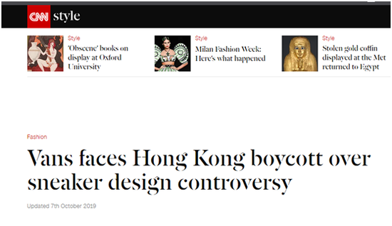 香港暴乱题材作品入选Vans设计比赛,Vans中国(Vans China)网站的客服表示,Vans方面“发现这个作品不符合比赛规定时就已经取消该作品的参赛资格”。 在公众注意力聚焦火箭队总经理莫雷涉港言论之时,美国极限运动品牌范斯(Vans)也因为一双鞋的设计,被推上与香港有关的风口浪尖。