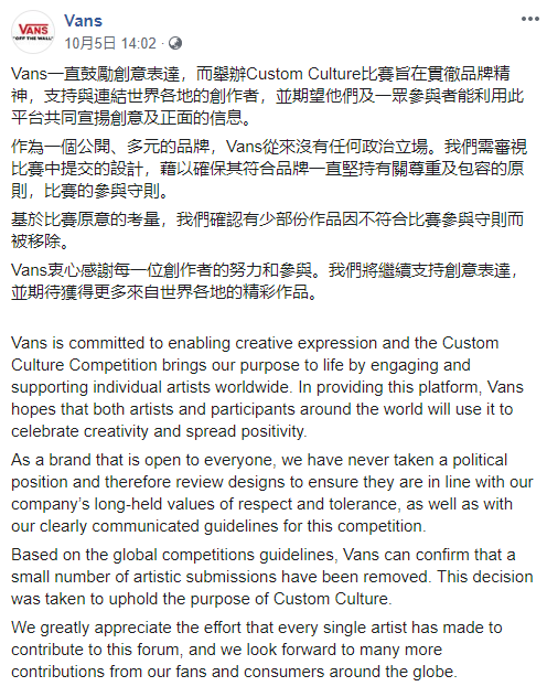 10月5日,距离投票结束还有一周多时间,这一争议作品被移除。当天,范斯(Vans)还在其脸书账号发布声明称,“我们确认有少部分作品因不符合比赛参与守则而被移除”。但声明并未点出具体是哪些作品。 这份声明还表示,作为一个公开、多元的品牌,Vans从来没有任何政治立场。