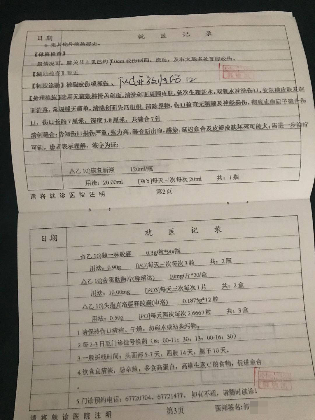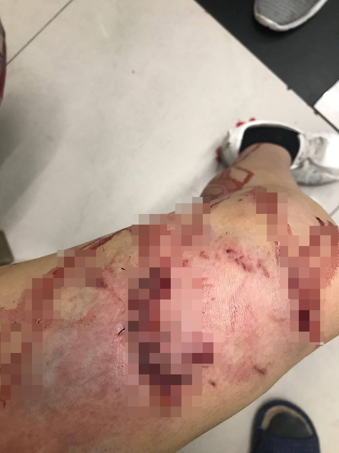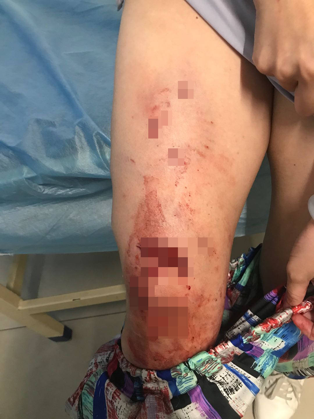 烈性犬撕咬致陈女士右腿多处受伤。本文图片 受访者供图 上海一小区内,未束牵引带的烈性犬突然蹿出撕咬陈女士,致其右腿缝七针。 9月30日,上海松江警方告诉澎湃新闻(www.thepaper.cn)记者,伤者被及时送医救治,无生命危险,肇事犬只已被收容处理,携犬只外出未束牵引带当事人被处以行政罚款处罚。 9月27日17时许,松江区佘山世茂纳米魔幻城小区内,突然蹿出的烈性犬狠狠撕咬住陈女士的右腿,长达一分多钟,致其右腿产生七厘米伤口与多处牙洞,露出内部组织,血肉模糊。 烈性犬撕咬致陈女士右腿多处受伤。 10月1日,受害者陈女士的丈夫陶先生告诉记者,事发前,陈女士在自家门口休息,6岁的女儿在身边跳绳,自己则在一旁侍弄花草。 “一条黑色罗威纳犬突然从屋旁的道路上蹿出来,冲向我女儿。”陶先生称,陈女士见状立马挡在女儿身前。 罗威纳犬随即将陈女士扑倒,并狠狠咬住她的右腿。“当时狗主人的朋友在旁边,我和他立马上前制止。”陶先生说,当时他骑在狗的后背,抓住狗的耳朵,并尝试掰开狗的嘴巴,狗主人的朋友抱住狗的脖子,试图将狗制服。 但罗威纳犬凶猛异常,死死咬住陈女士不放,在陶先生施救过程中,罗威纳犬在陈女士右腿膝盖及以上部位撕咬了三次。 就医记录显示,伤口七厘米,深度一厘米。 “整个过程持续一分多钟,我老婆十分痛苦,右腿血肉模糊。”陶先生称。 据陶先生提供的受伤图片、视频显示,陈女士右腿有多处牙齿咬成的孔型伤口,膝盖处的皮肉被撕咬掉,产生较长伤口,露出内部人体组织。 陈女士的就医记录显示:患者下肢开放性伤口长约7厘米,深度1厘米,共缝合7针,大腿多处有牙印咬伤。患者伤口损伤严重、张力高,缝合后出血、感染、延迟愈合及皮瓣皮肤坏死可能大,有需进一步治疗可能。 陶先生告诉记者,罗威纳犬是一种烈性犬,事发时并没有佩戴狗绳。他称,陈女士被送医后,狗主人垫付了当天2000元的医药费,并承诺会承担之后产生的所有费用。事发后,狗主人主动上交了肇事犬只。 松江警方向记者透露,9月27日,松江公安分局接报警,佘山辰花路一小区内发生一起犬伤人事件。接报后,警方第一时间赶赴现场处置。经工作,伤者被及时送医救治,无生命危险。目前,根据《上海市养犬管理条例》相关规定,警方已将肇事犬只作收容处理,并对携犬只外出时未束牵引带的当事人赵某予以行政罚款处罚。 |