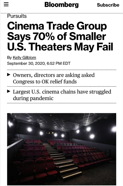这场大流行给电影院带来了毁灭性的财政打击。93%的电影院公司在2020年第二季度亏损超过75%。如果这种现状继续下去,69%的中小型影院公司将被迫申请破产或永久关闭,66%的影院工作岗位将流失。我们国家不能失去剧院所提供的社会、经济和文化价值。