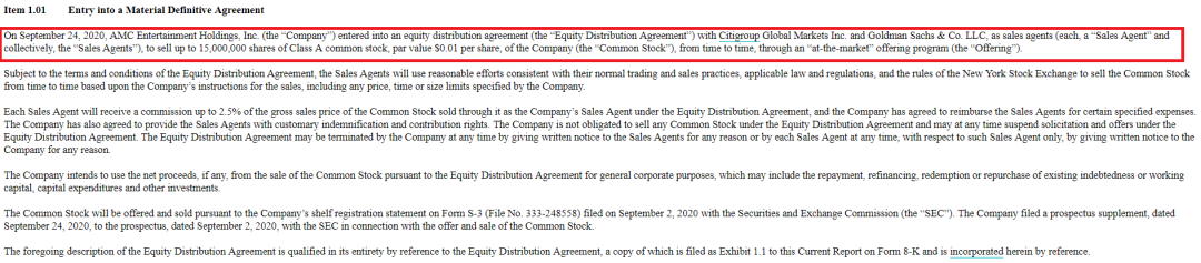 为偿还债务,AMC在9月24日的公告中也表示将出售1500万股股票,以筹集资金应付卫生事件带来的影响,包括偿还、再融资、赎回或回购现有债务或营运资本、资本支出和其他投资。