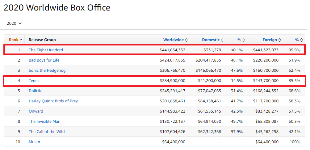 中国地区票房收入反而成为了《信条》的最大支撑。根据Box Office Mojo统计数据,截至目前,这部电影已经获得了2.84亿美元的票房收入,其中中国地区的票房收入已超4亿元人民币(约合6200万美元),远超北美成为该电影的第一大票仓,也将《信条》送上了2020年全球票房第四的位置。