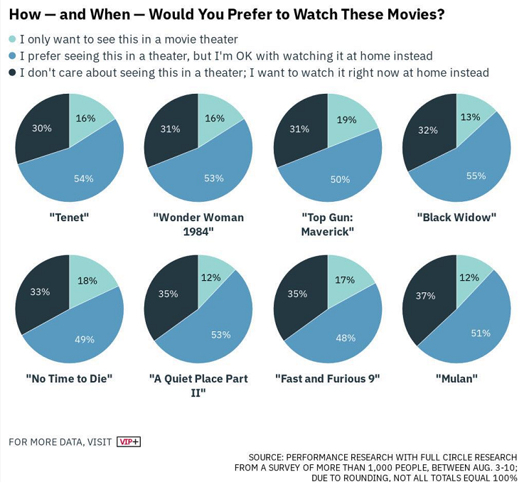 就算之前的院线到线上90天窗口期,只有12%的观众表示一定要在影院先看新片才行,15%的观众表示可能先在影院看,29%的人不在乎是去影院看还是在家看,21%的人可能会在家看,23%的人一定要在家看。