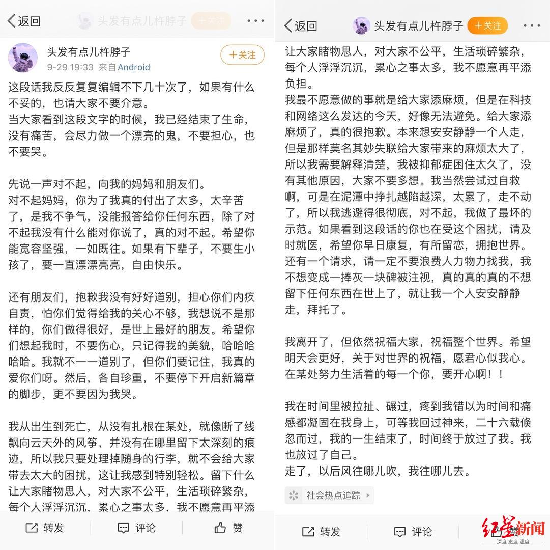 “我被抑郁症困住太久了,没有其他原因,大家不要多想,我当然尝试过自救啊,可是在泥潭中挣扎越陷越深,太累了,走不动了,所以我逃避得很彻底,对不起,我做了最坏的示范……” 26岁的辽宁女孩阿杵(小名),于9月29日晚上7点33分,在微博上发布了一篇近千字的“遗书”后失联。家属在报警后得知,阿杵在发博当天下午三点曾在四川峨眉山坐索道上山,到了金顶后失去了踪迹。红星新闻记者了解到,由于最近天气恶劣,搜救很难开展,景区也曾派人悬崖下搜救,但因搜救难度太大,目前暂时没有收获。希望有见到过阿杵的人提供线索,为搜救她多一份希望。 阿杵 失联前留下“遗书” 大学室友:她两年前曾确诊抑郁症 起初,很多人从阿杵的微博发现了不对劲,一封长达千字的“遗书”透露出对所有人的告别:“本来想安安静静一个人走,但是那样莫名其妙失联给大家带来的麻烦太大了,所以我需要解释清楚。” 这条长微博中,阿杵用温柔的文字向妈妈和朋友们告别,甚至开着小玩笑“希望你们想起我时,不要伤心,只记得我的美貌,哈哈哈。”截至目前,这条微博转发已过万,点赞已达十万,大家都在为寻找阿杵努力。 阿杵的微博内容 阿杵曾经的大学室友小邢在几分钟后就发现了这条微博,她没想到29号上午还和大家正常聊天的阿杵,选择了这样的方式离开大家,“她还在回复室友发的图片好看,我们没有发现一点异常。”小邢告诉红星新闻记者,阿杵是辽宁人,已经大学毕业四年,后来到了深圳工作,虽然异地,但大家还是在网上保持着联系。 事发当天,阿杵在微信群正常聊天 “当时立即向深圳警方报了警,但警方查到阿杵一个多月前就已经搬走了,她曾对朋友说回辽宁老家,但朋友后面联系到阿杵妈妈,她并没有回去。”随着事情的进展小邢越来越担心起来,据她介绍,阿杵在两年前确诊为抑郁症,“我们知道她有抑郁症,知道她的情绪不是很好,但平时聊天也没问题,真的没有想到她到了这一步,最后警方查到她去了成都。” 阿杵 到峨眉山金顶后失踪 家属报警并赶到乐山 搜救3天暂无果 “我们也报警了,最后查到7月31号从深圳飞的成都,8月5号去了峨眉山,在那边住了两个月酒店,9月29号写了那个微博就失联了。”阿杵妈妈贾女士得知女儿失踪后赶紧赶到了乐山,监控显示,女儿在29号下午三点坐了索道上山,到了金顶后失去了踪迹。 阿杵 对于女儿的失联,贾女士一点也没有感觉到征兆,虽然是单亲家庭,但母女感情一直很好,“我都不知道她有抑郁症,她和我聊天表现得很正常,没有察觉到问题,现在回想,9月3号我说过去深圳看她,她不让我去,说这段时间忙,等忙完了给我买机票再过去,但其实那个时候她都不在深圳了。” 在阿杵的微博里,有日常吐槽唠嗑,也有和朋友的友谊之情,也有表达对妈妈爱的内容,“我妈是一个为了生活和爱情都奋不顾身的勇敢女人,只是缺少了一丝运气,总是受伤,但她一直努力,也一直爱,如果真有命运这回事,我愿意把我的好运都渡给她,请命运赐给我妈妈一位良人吧,让她踏踏实实过余生,嘿嘿,少女的祈祷……” 贾女士告诉红星新闻记者,再婚的时候,女儿就不怎么愿意回家,自己想去看她,她又不愿意,“她的病应该是有家庭原因,但是她在我面前表现得很正常,我没有意识到,还给我打钱让我用。” 阿杵失联后,她妈妈发的朋友圈 家人朋友报警以后,警方对金顶开展了搜救,但目前没有收获,峨眉山景区工作人员表示,近段时间山上一直下雨,大雨加上大雾,搜救难度很大,也曾派人到悬崖下搜过,但目前仍未发现踪迹。 根据监控显示,阿杵前往金顶时身穿黑色长款外套,黑色长裙,头戴黑色帽子,身背黑色包,希望有看见过她的朋友提供线索,为搜救她多一份希望! 红星新闻记者 刘成梦 |