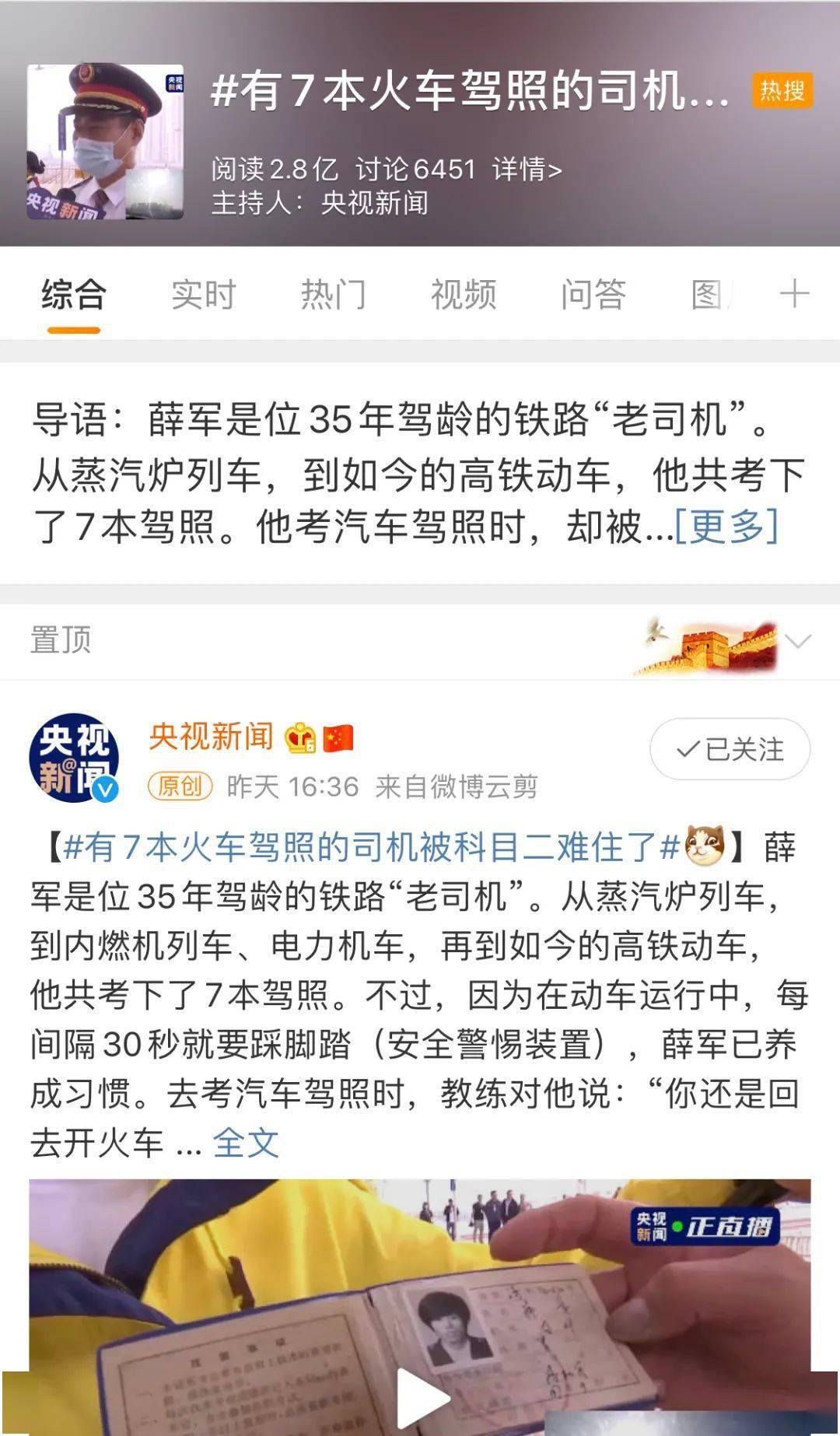 这两天,“有7本火车驾照的司机被科目二难住了”话题冲上热搜。 薛军是一位有着35年驾龄的铁路“老司机”,他的职业生涯中,共考取了7本火车驾照。但是,这位“老司机”,竟被汽车驾照科目二难住了…… 从蒸汽机车到内燃机车、电力机车,再到如今的高铁动车,薛军的7本驾照见证着中国铁路的发展变迁。 ▽滑动查看薛军的7本驾照 ▽ 各种火车都能开的薛军,却唯独开不了汽车。原来,在高铁列车驾驶室操作台下有个小踏板,高铁司机在驾驶过程中必须每隔30秒踩一下,否则“无人警惕装置”会报警。薛军在准备考汽车驾照时,也总是习惯性地踩刹车,面对驾校教练的疑问,薛军说:“我是开火车的,看到线路上有人,我要做的第一件事就是减速。” “安全行驶”已牢牢地刻在薛军的骨子里,驾校教练也只能说:“您还是回去开火车吧!” 视频一经发布,便引起广泛关注,网友纷纷表示:术业有专攻,火车需要你。 手持7本火车驾照见证了中国铁路的发展和“中国速度”的崛起,薛军也许当不成汽车司机,但他是当之无愧的最好的火车司机之一。为铁路“老司机”点赞! 来源:央视新闻 |