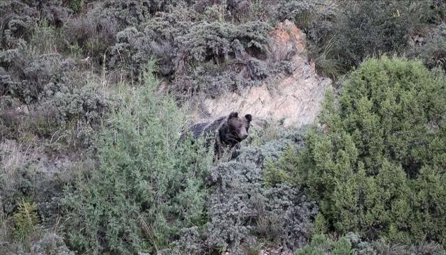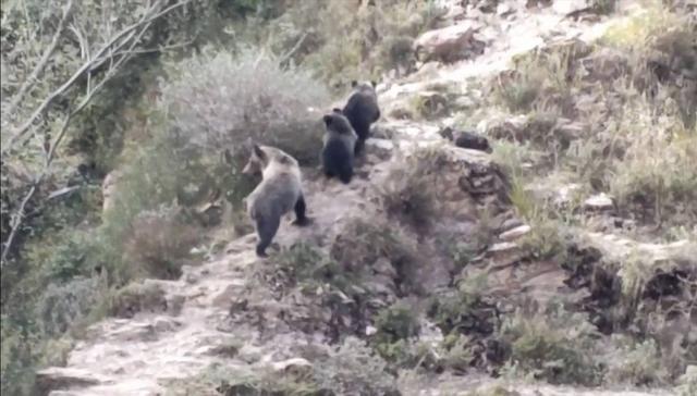 “当时天马上就黑了,山里忽然下起了冰渣子,藏棕熊就在镜头里出现了。开始还在树林间若隐若现,后来它跑到一个光秃秃的山下,看得非常清楚。它状态很好,非常健壮。”李理介绍。很快,大家又发现了第二只。当时队员们的衣服都打湿了,在海拔4000多米的高山上非常冷,但还是给相机做好防水,拍下这宝贵的画面。第二天傍晚,还在同一地点,前一天晚上观测到的一只藏棕熊再次出现,不过这次,它带了两只小熊。大公熊强壮而霸道,带幼崽的母熊小心谨慎,小熊憨态可掬,都非常可爱。