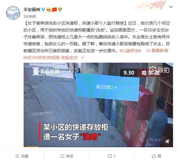 近日,哈尔滨几个邻近的小区,用于临时存放的快递柜都遭到“洗劫”。监控画面显示,一名50岁左右女子拎着麻袋,把快递柜上凡是大一点的包裹统统收入袋中。失主高女士就有两件快递被偷,包括女儿的一双鞋。据了解,事后快递小哥自掏腰包赔偿了失主。目前辖区派出所已接到报案,该案正在进一步处理中。 |
