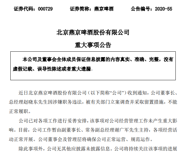 10月8日傍晚,知名啤酒企业燕京啤酒(000729,SZ)突发“黑天鹅”事件。 公告显示,公司近日收到通知,其董事长、总经理赵晓东因涉嫌职务违法,被有关部门立案调查并采取留置措施,不能正常履职。目前,公司工作暂由副董事长、常务副总经理谢广军先生主持,各项经营活动正常开展。 赵晓东何许人也? 履历资料显示,赵晓东于1972年6月生,毕业于北京工业大学,研究生学历,高级工程师。2001年获顺义科技进步一等奖,2002年被授予第二届全国优秀设备工作者称号,2003年获第十三届北京优秀青年工程师称号,2004年获第二届北京市优秀青年企业家银奖,2005年被授予北京市劳动模范称号。 2003年,29岁的赵晓东被选举为燕京啤酒副总经理,2012年8月被选举为公司总经理,2017年9月被选举为公司董事长,目前年薪70.8万元。 根据燕京啤酒2019年年报,除了在上市公司任职外,赵晓东还是燕京啤酒的实际控制人——北京控股有限公司担任董事局副主席、执行董事;在燕京啤酒控股股东北京燕京啤酒投资有限公司担任副董事长。 据报道,赵晓东最后一次公开露面是在9月17日主持公司的临时股东大会上,在那次会议决议中,其顺利连任公司非独立董事、董事长职位。 “寒冬”雪上加霜? 赵晓东在燕京啤酒的时间已经超过20年,其任董事长前的2016和2015年,燕京啤酒营业收入和营业利润均处于负增长,2016年更是营业利润同比下滑39.53%。 赵晓东上任三年间,燕京啤酒的营收状况仍然不太理想,但总体实现了扭亏为盈。2018年燕京啤酒营业收入113.4亿,同比增长1.32%,2019年营业收入114.7亿,同比增长1.1%。 图:豹变 今年上半年,尤其是一季度受疫情对聚会消费场景拖累,燕京啤酒业绩下滑厉害,实现营业收入55亿元,同比下滑14%,实现净利润2.7亿元,同比下滑47%。相比之下,华润啤酒、青岛啤酒均实现了净利润同比双位数增长。 万德数据显示,燕京啤酒在行业内市值第三,不到青岛啤酒的1/3,与第四名的珠江啤酒并未拉开差距。同受疫情刺激的情况下,青岛啤酒归母净利润仍然实现了13.77%的增长,而燕京啤酒同比下降了47.46%。 目前,燕京啤酒的营收增速和利润增速均低于行业平均水平。 啤酒行业在向高品质、个性化产品市场进军时,燕京啤酒在中高端市场的“战况”并不佳。燕京啤酒以鲜啤作为中档酒代表,纯生作为高端代表,陆续推出了燕京U8、燕京7日鲜等产品,但并未受到市场青睐。 2020年上半年数据显示,华北、华东、华南、华中、西北五大区域在燕京啤酒总营收中的销售占比分别为44.73%、8.41%、30.61%、9.78%、6.47%,比上年同期分别减少8.34%、18.64%、19.25%、14.58%、15.09%,在所有主要区域的市场均“退败”。 国庆之前,燕京啤酒的股票报价为8.43元/股,市值为237.6亿元。 |