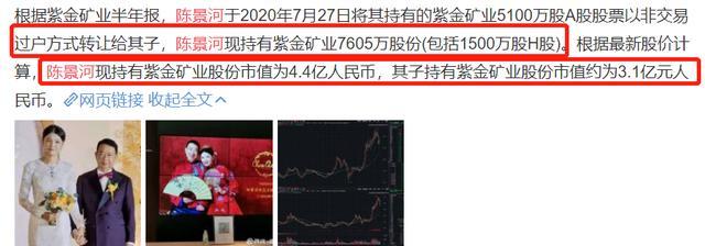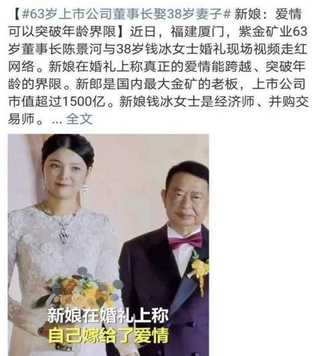 10月8日,63岁的紫金矿业董事长陈景河迎娶了38岁的女交易师、前女模钱冰引来网友的热议和轩然大波,对于二人的年龄差距等问题引发了不小的争议,而婚礼的现场视频中,新娘则在致辞中表示:“我们想用一段婚姻来证明,真正的爱情能跨越、突破年龄的界限!” 婚礼现场新娘为了迁就新郎,还穿了平底鞋的小细节也受到了不少关注,据悉,新郎陈景河是国内金矿最大的老板,上市公司市值超过了1500亿,虽然新娘钱冰在现场的言谈举止间,充满了独立女性的自信,但她的那句“在某个时候爱情可以突破年龄界限”被网友群嘲:老牛吃嫩草,说两人是“父女恋”。 但其实能让一千五百亿身家的陈景河心甘情愿娶自己的姑娘想必也不是等闲之辈,根据知情人爆料,这位新娘旧照被扒出来,看起来和现在的颜值差距较大,而且她为了挤入上流社会,一直都在做有钱人的生意。 她这次如愿以偿嫁给了陈景河也属于逆袭成功了,根据知情人的爆料,说钱冰很注重颜值和身材管理,还经常到处跑去和名人合影,现在嫁给拥有千亿市值的金矿公司大老板也算得其所愿了! 对比当年的旧照,钱冰看起来也是变化很大了,如今妥妥的阔太范儿十足,对比能搞定能超级富豪默多克的,跻身全球十大超级富豪太太的邓文迪也是有过之而无不及啊! 据悉在今年7月27日,陈景河已做好家庭财产分配部分安排,将持有的公司5100万股A股股票转让给了儿子,按最新股价测算,这些股票价值3.14亿元。有网友猜测这是陈景河留一手的准备。 从刘强东与章泽天,王石与田朴珺,再到这次的陈景河与钱冰,看起来大佬们都选择了年龄差距大并不被看好的婚姻,但其实如饮水者,冷热自知啊! |