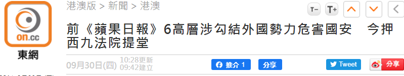 据香港“东网”报道,香港警方国安处于6月拘捕多名壹传媒集团高层,其中壹传媒行政总裁张剑虹及前《苹果日报》总编辑罗伟光,连同集团旗下3家公司,被控一项串谋勾结外国或者境外势力危害国家安全罪,违反香港国安法及《刑事罪行条例》。此外,前《苹果日报》执行总编辑林文宗、前副社长陈沛敏,及2名主笔冯伟光和杨清奇其后也被捕,同样控以串谋勾结外国或者境外势力危害国家安全罪,两案今天(30日)会在西九龙法院一同提讯,由法官苏惠德审理。 报道称,杨清奇(55岁)、陈沛敏(51岁)、冯伟光(57岁)、林文宗(51岁)等4名被告,被控于2020年7月1日至2021年4月3日期间(包括首尾两日),在香港与苹果日报有限公司、苹果日报印刷有限公司、AD Internet Limited(苹果互联网有限公司)、张剑虹、罗伟光、乱港分子黎智英及其他人一同串谋,请求外国或者境外机构、组织、人员实施对香港特区或者中国进行制裁、封锁或者采取其他敌对行动。 至于另一案,5被告依次为苹果日报有限公司、苹果日报印刷有限公司、AD Internet Limited、张剑虹(59岁)及罗伟光(47岁)。本案控罪称,3间公司及2名被告于2020年7月1日至2021年4月3日期间,在香港与黎智英及其他人一同串谋,请求外国或者境外机构、组织、人员实施对香港特区或者中国,进行制裁、封锁或者采取其他敌对行动。 |