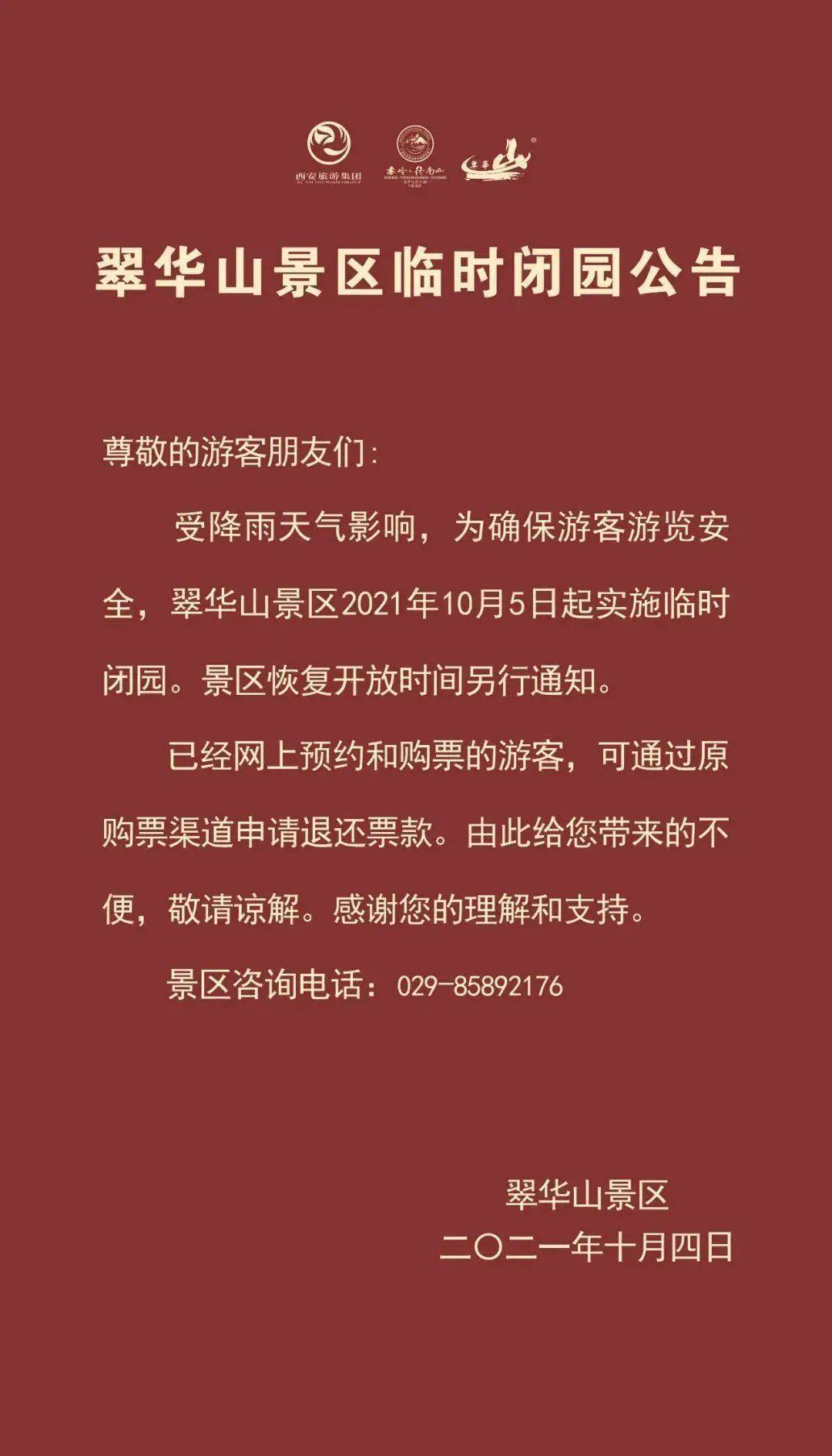 受天气影响 西安、延安、宝鸡、汉中等地 多个知名景区临时关闭 10月4日8时至5日8时,陕北、关中和陕南西部中到大雨和暴雨,其中延安中东部、宝鸡西南部、汉中西南部局地大暴雨。 受降雨影响,陕西省境内共有25条河流30站出现洪峰43次,其中有7条河流7站出现超警戒洪峰12次。 5日8时,渭河干流咸阳水文站出现3190立方米每秒流量,临潼水文站出现3070立方米每秒流量,形成渭河2021年第3号洪水。 汉中 因普降大到暴雨 截至5日8时 汉中市共撤离8911户21062人 关闭山岳型和涉水景区26处 据不完全统计,本轮强降雨造成宁强、略阳、留坝不同程度受灾,道路交通、电力通讯、人饮工程等基础设施受损,无伤亡人员报告。详细灾情正在进一步统计之中。 10月5日早上8点左右,因连日暴雨,京昆高速四川往西安方向1390公里(勉县段元墩隧道附近)发生大面积滑坡,导致道路单幅中断。 延安 降雨致延安甘泉多地滑坡 出行受阻 甘泉大峡谷景区关停 10月3日至5日以来,延安市甘泉县发生持续强降雨天气,甘志路(甘泉至志丹)下寺湾段至石门段多处落石、滑坡等情况,路面积水,造成车辆短时间无法通行,部分路段禁止通行。 交警、路政等相关部门及时赶到现场进行清理,保证道路畅通。 因暴雨影响,甘泉大峡谷景区也于10月4日开始劝返游客,10月5日关闭。 陕西省气象台 继续发布 暴雨黄色预警 过去24小时宝鸡南部、榆林东南部、延安大部、陕南西部的部分地方出现了50毫米以上的降水,且预计未来24小时上述地区强降水仍然继续。预计10月5日14时至6日14时,陕北南部、关中大部、陕南西部有大雨(20-45毫米),其中延安南部(宜川、富县、洛川、黄陵、黄龙)、宝鸡南部(凤县、太白)、西安南部(周至)、汉中大部、安康北部(宁陕、石泉)等县区有暴雨(50-80毫米),汉中南部局地(宁强、南郑)有大暴雨(100-120毫米)。 过程期间最大小时雨强20-30毫米,上述地区的相邻县区也需高度关注。强降水影响区域易出现滑坡、泥石流、崩塌等地质灾害,山洪和中小河流洪水气象风险等级高,请做好应急准备工作,关注当地预警信号和短临预报,适时采取应急措施。另外,全省大部分地方气温较低。 据不完全统计 陕西省目前关闭的景区有: ▼ 西安 翠华山景区 据翠华山景区消息,受降雨天气影响,翠华山景区于10月5日起实施临时闭园 。 西安南五台景区关闭 10月4日,西安南五台景区发布公告称,受降雨天气影响,为确保广大游客生命财产安全,南五台景区暂时闭园,停止售票 。开放时间视情况另行通知。 渭南 华山 据华山风景名胜区消息,按照防汛工作要求,为确保安全,经研究,决定自2021年10月4日18时起,华山景区封山闭园 。 汉中 10月4日晚,汉中市文化和旅游局发布消息称,受强降雨天气影响,为切实做好防汛防洪及地质灾害预防工作,确保游客生命财产安全,汉中部分景区开闭园时间有所调整,其中涉及龙头山国际旅游度假区、红寺湖风景区、洋县朱鹮梨园景区、华阳景区、骆家坝景区、陕西五龙洞国家森林公园、留坝县紫柏山国家森林公园、佛坪熊猫谷景区 等,具体内容如下↓↓↓ 龙头山国际旅游度假区 接南郑区文化和旅游局通知,近日汉中市将出现短时强降雨天气。因此,为确保广大游客生命财产安全,同时做好防汛工作,龙头山景区决定于2021年10月4日13:00 暂时闭园,当日停止售票。待本次强降雨过后景区即恢复正常开放。请游客朋友合理安排出行计划。如需办理退票事宜,可联系原购票平台进行退票处理。 景区游客中心电话:0916-8158888 汉中龙头山国际旅游度假区 2021年10月4日 红寺湖风景区 因受强降雨天气影响,为切实保障广大游客朋友人身财产安全,红寺湖景区于2021年10月4日 起闭园。给您带来的不便,敬请谅解。 景区咨询电话:0916-5583777 陕西汉之源文化发展有限公司 2021年10月4日 洋县朱鹮梨园景区 根据汉中市气象部门预报,我市将有持续强降雨天气,为切实做好防汛和地质灾害预防工作,确保游客人身安全,朱鹮梨园景区自2021年10月4日 起暂停开放,禁止游客在景区滞留、过夜,由此给您带来的不便,敬请谅解。 景区咨询电话:0916-8221576 洋县朱鹮梨园景区管理委员会办公室 2021年10月4日 华阳景区 因受强降雨天气影响,为确保广大游客生命财产安全,同时做好防汛工作,华阳景区决定于2021年10月4日13:00 暂时闭园,当日停止售票。待本次强降雨过后景区即恢复正常开放。请游客朋友合理安排出行计划。如需办理退票事宜,可联系原购票平台进行退票处理。 景区咨询电话:0916-8372586 洋县长青华阳景区旅游服务有限公司 2021年10月4日 骆家坝景区 因目前骆家坝景区持续性降雨,为保证游客旅游出行安全,同时做好防汛工作,骆家坝景区决定于2021年10月4日15:00 临时闭园,由此给您带来的不便,敬请谅解。 景区咨询电话:0916—6438588 西乡县骆家坝景区管委会 2021年10月4日 汉江源景区 根据雨情信息及上级部门指示,为保证游客旅游出行安全,汉江源景区决定于2021年10月4日 临时闭园,由此给您带来的不便,敬请谅解。 请广大游客朋友们及时关注景区官方公众号,并于出游前拨打景区服务电话进行咨询,合理安排旅游行程。 景区咨询电话:0916-4222385;0916-4433777 汉江源景区管理部 2021年10月4日 陕西五龙洞国家森林公园 因受强降雨天气影响,为确保广大游客生命财产安全,陕西五龙洞国家森林公园2021年10月4日起 暂时闭园、停