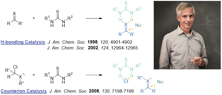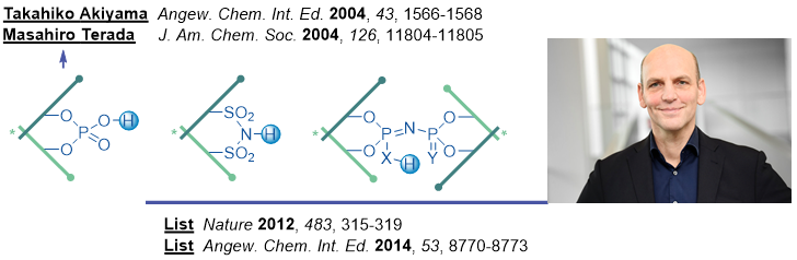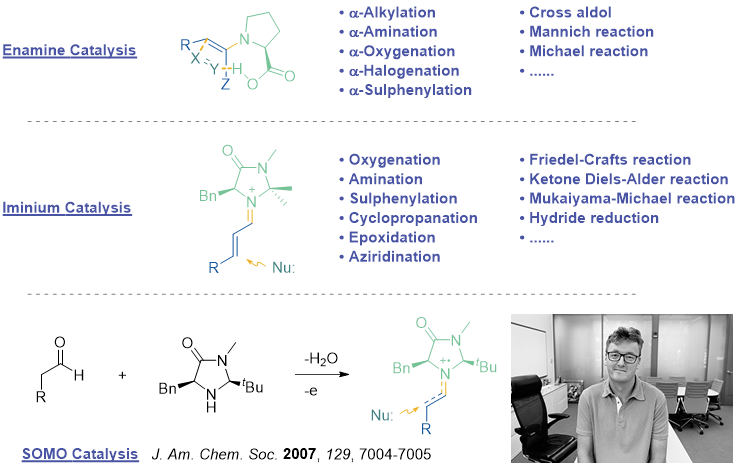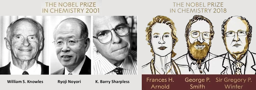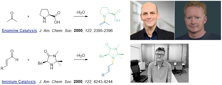 2021年诺贝尔化学奖得主 本亚明·利斯特(Benjamin List) 图源:kofo.mpg. 2021年诺贝尔化学奖得主 戴维·W·C·麦克米兰(David W. C. MacMillan) 图源:cen.acs.org ▼ 刚刚,瑞典皇家科学院宣布,2021年诺贝尔化学奖授予Benjamin List、David W. C. MacMillan,以奖励他们 “对于有机小分子不对称催化的重要贡献”。 诺贝尔化学奖一度被认为是“理综奖”,奖励过很多传统的化学家,也奖励了不少与化学交叉的工作。此次奖励有机小分子不对称催化,被认为是回归到认可传统化学。 “作为化学工作者,我们当然希望化学奖能够回归传统化学,这是对化学这一基础学科中奋斗的科研工作者极大的激励。”香港科技大学副教授、有机化学家黄湧评论说。 他同时表示,“我们也认为越来越多的交叉学科工作会获奖,这也是大势所趋。但这不意味着化学本身已经枯竭。和大自然相比,我们对分子的认知、合成与调控其功能的能力仍然处于蹒跚学步的阶段。而传统化学的突破,更加能够撬动交叉学科颠覆性工作的发现。” 《知识分子》特邀深圳湾实验室研究员陈杰安对有机化学合成中的不对称催化进行解读,并梳理不对称催化领域的重要进展。 撰文|陈杰安(深圳湾实验室研究员) 审阅|黄湧(香港科技大学) ● ● ● 诺贝尔化学奖一度被认为是 “理综奖”,奖励过很多传统的化学家,也奖励了不少与化学交叉的工作。此次奖励有机小分子不对称催化,被认为是回归到认可传统化学。 “作为化学工作者,我们当然希望化学奖能够回归传统化学,这是对化学这一基础学科中奋斗的科研工作者极大的激励。”香港科技大学副教授、有机化学家黄湧评论说。 他同时表示,“我们也认为越来越多的交叉学科工作会获奖,这也是大势所趋。但这不意味着化学本身已经枯竭。和大自然相比,我们对分子的认知、合成与调控其功能的能力仍然处于蹒跚学步的阶段。而传统化学的突破,更加能够撬动交叉学科颠覆性工作的发现。” 《知识分子》特邀深圳湾实验室研究员陈杰安对有机化学合成中的不对称催化进行解读,并梳理不对称催化领域的重要进展。 目前已知的所有生命系统中,碳原子是不可或缺的组成。而在碳基世界里,相关研究可大部分纳入 “有机合成” 的范畴——自然界的有机体利用酶活大分子推动生命周期的运转,比如绿色植物的光合作用,“神农百草” 中对应症结真正起效用的物质,动物体内的消化代谢,细胞内生物大分子(蛋白、核酸、脂质、糖类)介导的能量及信号的传导,这一系列活动均有碳的参与,都可以凝练为宏观角度下的有机合成途径。甚至于人类社会现阶段最为重要的能量来源,石油天然气也隶属于这一逻辑下的产物。 人类社会的发展已经步入工业4.0时代,合成化学家对反应的追求早已从单纯的能量转化及分子拼接,进入到效率及多样性的探索,而“催化”的理念是这一步途最重要的里程碑。在工业制造中化学家应用各种有机反应构建有机分子,而整个过程往往涉及一系列繁复的化学反应,而每一步反应的效率均会影响整体生产效率的表观,而大量工业废物也会因此而产生,我们需要“催化”来极大程度提高转化效率。 催化剂是反应进行的药引,与反应底物的相互作用可以帮助反应克服固有的活化能垒,从而降低反应所需的条件,使原本被戒断的途径得以存续,亦或使原本低效的转化变得高效且更为完整。 当下频繁使用的催化剂品类,可以大致归纳为酶、过渡金属或者有机小分子,最后者的意义在于使用了低分子量的催化剂,相较而言具有较高的原子经济性以及环境友好性。从反应的本质而言又可大体分为两类,包括非手性催化以及手性催化反应,后者的意义在于反应将借由手性催化剂从无到有地创造具有手性特征的目标分子。我们将集中围绕有机小分子的不对称催化展开溯源及探讨。 手性特征,是左手与右手的关系,可以镜面重合而无法在空间上完整重叠。天然的20个氨基酸中有19个具有手性特征,以此为基础单元所形成的多肽、蛋白以及动态生命过程中的各种囊腔均具有特殊的空间指纹密码,并以此来区分每个转化历程的可与否,识别每个反应潜手性面的上与下。相较而言,过渡金属不对称催化的发展更具脉络,作为人类首次探索不对称有机合成的工具,从Nozaki与Noyori报道的不对称环丙烷化反应,到Knowles报道的均相不对称催化氢化,到Sharpless报道的不对称环氧化反应,到2001年三位不对称催化合成宗师凭借“手性催化氢化及氧化反应”的重要贡献而获得诺贝尔化学奖,星星之火到燎原之势的发展既顺理成章又按部就班。有机小分子不对称催化在同一周期内(1968-1997)亦有零星的报导,但始终仅作为限定的化学反应,并没有形成概念性的指引或者综述文献,而化学家对于不对称合成领域的关注与建议也更多地倾注于过渡金属及酶。 尽管如此,众多先锋者仍于此阶段形成了出色的研究成果,为诸多有机小分子不对称催化范式的构建奠定了夯实的基础,其中包括中国著名的科学家史一安及杨丹教授于烯烃不对称环氧化研究中的贡献(1996),包括至今仍是哈佛大学化学与化学生物学系中流砥柱的Eric Jacobsen教授关于氢键催化的首次定义(1998),也包括 Scott Miller 教授首次利用三肽的组氨酸模块实现二级醇的动力学拆分。 而直至2000年,这一领域才由两篇重要报导塑造了雏形: 1. 由 Benjamin List 教授、Rich