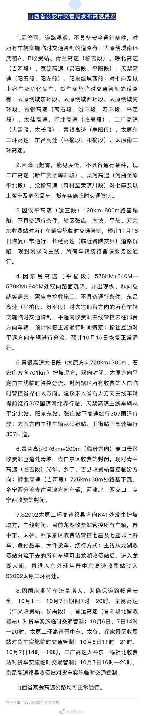 国庆假日期间,山西陕西甘肃等多地遭遇持续性降雨。受降雨影响,山西平遥古城、绵山风景区等部分景区临时关闭。 山西省重大地质灾害应急指挥部办公室6日发布通知,受本轮强降雨影响,10月5日,晋中市、吕梁市、临汾市先后发生多起崩塌、滑坡等地质灾害,造成人员伤亡,决定启动省级地质灾害ⅲ级应急响应。 山西祁县一铁路被洪水冲垮,火车连同铁轨悬空 10月6日,山西晋中市祁县有居民发布视频,南同蒲铁路祁县段某处铁轨被洪水侵袭,数米铁轨悬空。铁轨之上一列货运火车紧急停靠,场面十分危险。当地居民称洪水把铁路地基冲没了,只剩下铁轨和枕木在空中架着,像铁索桥一样。 受连日降雨和上游来水影响,山西省乌马河清徐县、祁县段昨天发生多处决堤,多处设施农业被淹,清徐县小武村等多个村庄进水,当地连夜组织8个村庄群众转移,目前没有人员伤亡情况报告。 乌马河是汾河一条区域性支流,发源于山西省太谷县与祁县交界处,全长93千米,流经太谷县、祁县和清徐县, 是一条季节河,上游建有庞庄水库一座。 乌马河进入清徐县境内后,由于地势增高等地理条件原因,成为一条悬河,高出周围平地数米,平时干涸无水。5日上午,由于连日发生较强降雨,加之上游水库泄洪,乌马河河槽形成洪水,乌马河按照每秒20立方米流量建设的堤坝受到冲击。从5日下午开始,乌马河水量迅速增长,由每秒40余立方米流量迅速增长到100余立方米每秒,洪水开始漫过河堤。对此险情,太原市委市政府、清徐县委县政府组织消防、武警、公安、山西水务集团建设投资公司、附近村民等各方力量,加固堤坝。随着洪水继续迅猛增长,流量高达每秒130多立方米,部分地段堤坝出现管涌等险情,并有决堤危险。面对危情,当地党委政府听取专家意见,迅速组织群众撤离受到洪水威胁的村庄。小武村、孟封村等8个村庄约15000群众连夜撤离至安全地带。 由于连日降雨,5日23时许,山西临汾蒲县荆坡村一带发生山体滑坡,造成5人被埋压。经过连夜抢险救援,被困人员全部救出,其中4人遇难、1人受伤。据了解,遇难者主要为交警值班人员。 5日,暴雨致太原市小店区煤机社区内涝加剧,积水最深处超1米,共3栋住宅楼近200户居民受影响。当地组织救援力量,连夜将群众转移至安全地带。 据央视新闻,记者6日从中国铁路太原局集团有限公司获悉,受连续降雨影响,太原局集团公司管内已有9趟列车停运,3趟晚点运行。此外,由吉林、银川、西宁、重庆等方向开来,途经太原、大同的列车也不同程度晚点或停运。其中太原局集团公司担当的1551次、k7807/8次、k604次、k866次、k731次、k610次、4641次、2604次列车停运;k603次、1552次、d5366次列车晚点运行。 目前太原局集团公司正积极做好旅客车票退改服务,在104个客运车站及时增开了改签、退票窗口。铁路部门提醒,旅客在出行前可及时关注车站公告或12306网站,了解列车开行信息,避免耽误行程。 6日凌晨,因连日持续降雨,导致京昆高速灵石段双向9处塌方,双向交通中断。二广高速太长段长治方向k834+700处边坡塌方,现场不具备安全通行条件。山西高速交警六支队采取临时交通管制措施,多个收费站封闭。 交警提示,国庆假期即将结束,高速公路也将迎来返程高峰,请广大驾驶员合理安排行程,提前绕行塌方路段,行车过程中如遇山体坠石、滑坡切勿冒险前进,如遇危险请及时报警求助。 受降雨影响,山西多家景区临时关闭。受近期降雨天气过程影响,晋中市平遥古城景区降雨量较大。为保障文物主体及游客安全,按照文物部门要求,双林寺彩塑艺术馆、平遥古城墙、同兴公镖局暂时关闭。 据了解,受连续强降雨天气影响,导致绵山风景区水位上涨,云雾不断,暂不具备游览条件。为保证游客游览安全及良好的游览环境,绵山风景区于10月6日当日临时封闭,广大游客需及时调整行程计划。同时,绵山风景区将进一步排查安全隐患,于10月7日正常开放。 此外,山西中太行洗耳河景区、云丘山景区、乌金山旅游区等景区,均受降雨影响临时闭园。 华北、西北多地降温如同“速冻” 河南有人裹被子出行 值得注意的是,7日至11日,我国大部地区气温将下降4~8℃,局地降温10℃以上;上述大部地区将伴有4~6级偏北风,新疆山口地区风力可达7-9级、阵风10~12级。北方大部地区将有小到中雨,局地大雨;新疆北部、甘肃、青海、内蒙古西部和东北部等地部分地区将有降雪或雨夹雪。 5日夜间至6日,位于北京延庆区小海陀山的国家高山滑雪中心山顶地区气温降至零摄氏度以下,赛区山顶出现降雪。 除了延庆区,北京门头沟江水河村,灵山也出现降雪。 另据@中国天气 消息,10月6日,北京百花山,因山区气温较低,现十月飞雪,大地瞬间换上冬装! 事实上不仅是北京,10月4日起,我国北方地区就遭遇冷空气和暴雨双重夹击。微博上,#河南不是降温是速冻#上了热搜。 河南多地降温,开始下雪,网友发微博称“这不是降温,这是速冻”。(图源:微博网友) 市民出行裹上了被子(图源:微博网友) 据中央气象台预报,“北方多地冷如11月”,华北、黄淮等地未来三天气温持续偏低,最高气温普遍将只有15℃左右,部分地区10℃左右。 从10月3日开始,新疆伊犁河谷普遍降下大雪,当地气象部门10月5日下午发布寒潮蓝色预警信号:预计6日到9日,伊宁市最低气温下降8℃以上,部分山区最低温度达到零下5℃至零下10℃。 新疆伊犁
