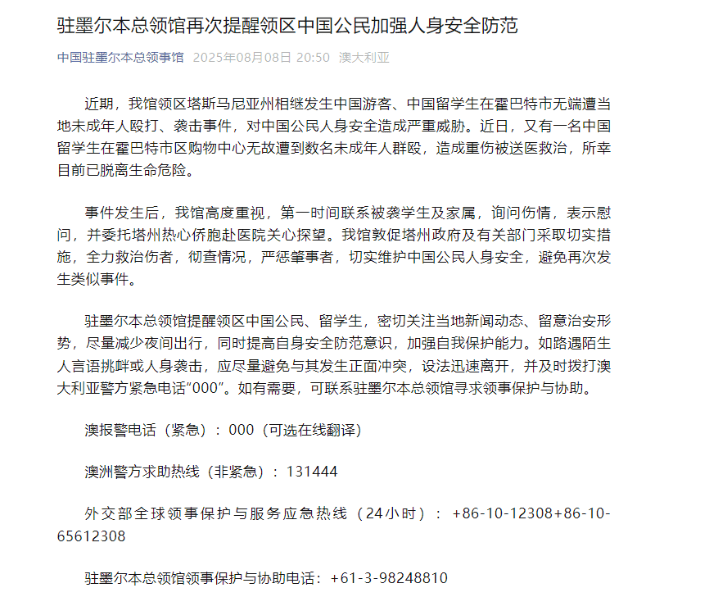 8月8日晚间,我国驻墨尔本总领馆发布公告称,近期,我馆领区塔斯马尼亚州相继发生中国游客、中国留学生在霍巴特市无端遭当地未成年人殴打、袭击事件,对中国公民人身安全造成严重威胁。 近日,又有一名中国留学生在霍巴特市区购物中心无故遭到数名未成年人群殴,造成重伤被送医救治,所幸目前已脱离生命危险。 驻墨尔本总领馆提醒领区中国公民、留学生,密切关注当地新闻动态、留意治安形势,尽量减少夜间出行,同时提高自身安全防范意识,加强自我保护能力。 据报道,7月下旬,在澳大利亚塔斯马尼亚州首府霍巴特市中心的繁华区域,一对中国游客夫妇被2名未成年女子袭击的事件震惊了当地社会。最终在目击此事的餐厅老板的帮助下,当地警方将两名肇事者顺利捉拿归案。 这起殴打事件发生在市中心富兰克林广场附近,泰国餐厅“曼谷城”的老板阿维·辛格表示,他和妻子在当天晚上8点30分左右下班回家时目睹了这一事件。据辛格回忆,这对中国夫妻被肇事青少年打到鲜血直流,躺倒在街边,夫妻两人情绪激动,而且似乎只能用中文沟通。辛格迅速联系警方,解救了这对游客。 ▲塔斯马尼亚警方 辛格表示:“当我看到这对中国游客倒在地上,我简直无法忍受,这种事必须停止。”他还回忆说,这对被殴打的中国游客看上去“惊魂未定,完全不能对我的帮助做出什么回应”。在警察赶到之后,辛格还带领现场警员追击肇事者,最终在一个公交站附近抓住分别为15岁和16岁的肇事者。 据报道,这对夫妇分别名叫Yoe和Xiaojing,这场突如其来的袭击持续了大约40秒,两人的手和腿都受了伤。当时这对夫妇完成了在澳大利亚为期13天的旅程,并将离开前的最后一站放在霍巴特。Yoe在接受当地媒体采访时表示:“这是我们第一次访问塔斯马尼亚,我们本来真的很兴奋。我们根本不认识这两个未成年人,也没有和他们说话搭讪。袭击就这样发生了,速度快得令人恐惧”。 ▲中国游客夫妇在霍巴特港口 当地警方称,一名15岁女孩已被起诉,同时正在调查一名16岁女孩的涉案情况。警方表示,两名青少年均已被拘留,同时还被指控犯有与袭击无关的其他罪行。 目前,塔斯马尼亚警察局已公布举报电话。 塔斯马尼亚多元文化委员会前主席艾门·贾弗里表示:“我们为这里的旅游业感到自豪,发生这样的事情是对我们形象的一种伤害。” |