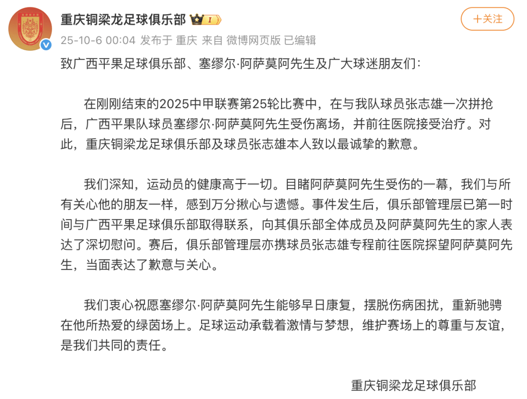 10月6日,广西平果足球俱乐部发布伤情通报: 10月6日凌晨,@重庆铜梁龙足球俱乐部 发布消息: 致广西平果足球俱乐部、塞缪尔·阿萨莫阿先生及广大球迷朋友们: 在刚刚结束的2025中甲联赛第25轮比赛中,在与我队球员张志雄一次拼抢后,广西平果队球员塞缪尔·阿萨莫阿先生受伤离场,并前往医院接受治疗。对此,重庆铜梁龙足球俱乐部及球员张志雄本人致以最诚挚的歉意。 我们深知,运动员的健康高于一切。目睹阿萨莫阿先生受伤的一幕,我们与所有关心他的朋友一样,感到万分揪心与遗憾。事件发生后,俱乐部管理层已第一时间与广西平果足球俱乐部取得联系,向其俱乐部全体成员及阿萨莫阿先生的家人表达了深切慰问。赛后,俱乐部管理层亦携球员张志雄专程前往医院探望阿萨莫阿先生,当面表达了歉意与关心。 我们衷心祝愿塞缪尔·阿萨莫阿先生能够早日康复,摆脱伤病困扰,重新驰骋在他所热爱的绿茵场上。足球运动承载着激情与梦想,维护赛场上的尊重与友谊,是我们共同的责任。 来源 广西平果足球俱乐部、@重庆铜梁龙足球俱乐部 |