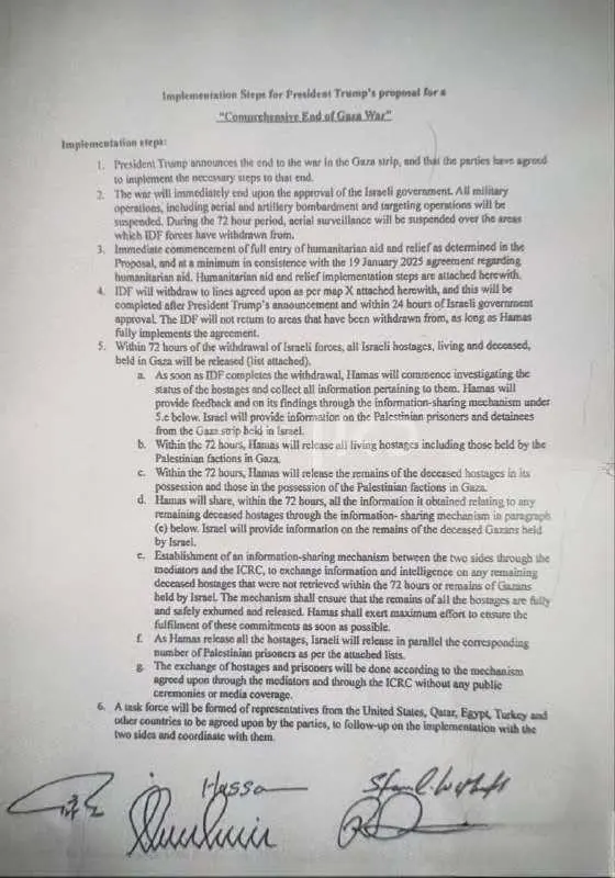 当地时间9日夜间,以色列公共广播公司Kan发布了以色列、哈马斯和调解员在埃及签署的释放被扣押人员和结束加沙冲突的协议副本。这份文件详细介绍了该协议的各个部分。 首先是美国总统特朗普宣布“结束加沙地带的战争,各方已同意为此采取必要步骤”。 第二部分明确,“经以色列政府批准后战争立即结束”,目前以色列政府正在开会对该协议进行投票,所有军事行动将停止。 第三部分要求“立即开始全面向加沙地带提供人道主义援助和救济”。 第四部分则表示“以色列国防军将撤至随附地图X所商定的线路,这将在特朗普宣布后、以色列政府批准后24小时内完成”,且表明“只要哈马斯全面履行协议,以色列国防军就不会返回已撤出的地区。” 第五部分写明,“在以色列军队撤离后的72小时内,释放所有被关押在加沙的以色列人员,包括活着的和死去的”。下一个子条款规定“随着哈马斯释放所有被扣押人员,以色列将同时释放名单相应数量的巴勒斯坦囚犯”,且被扣押人员的交换将根据调解人和红十字国际委员会商定的机制进行,不举行任何公开仪式或媒体报道。 最后的部分明确,“将由美国、卡塔尔、埃及、土耳其和其他经双方同意的国家的代表组成一个工作组,负责跟进双方的实施情况并进行协调。”(总台记者 李享) |
