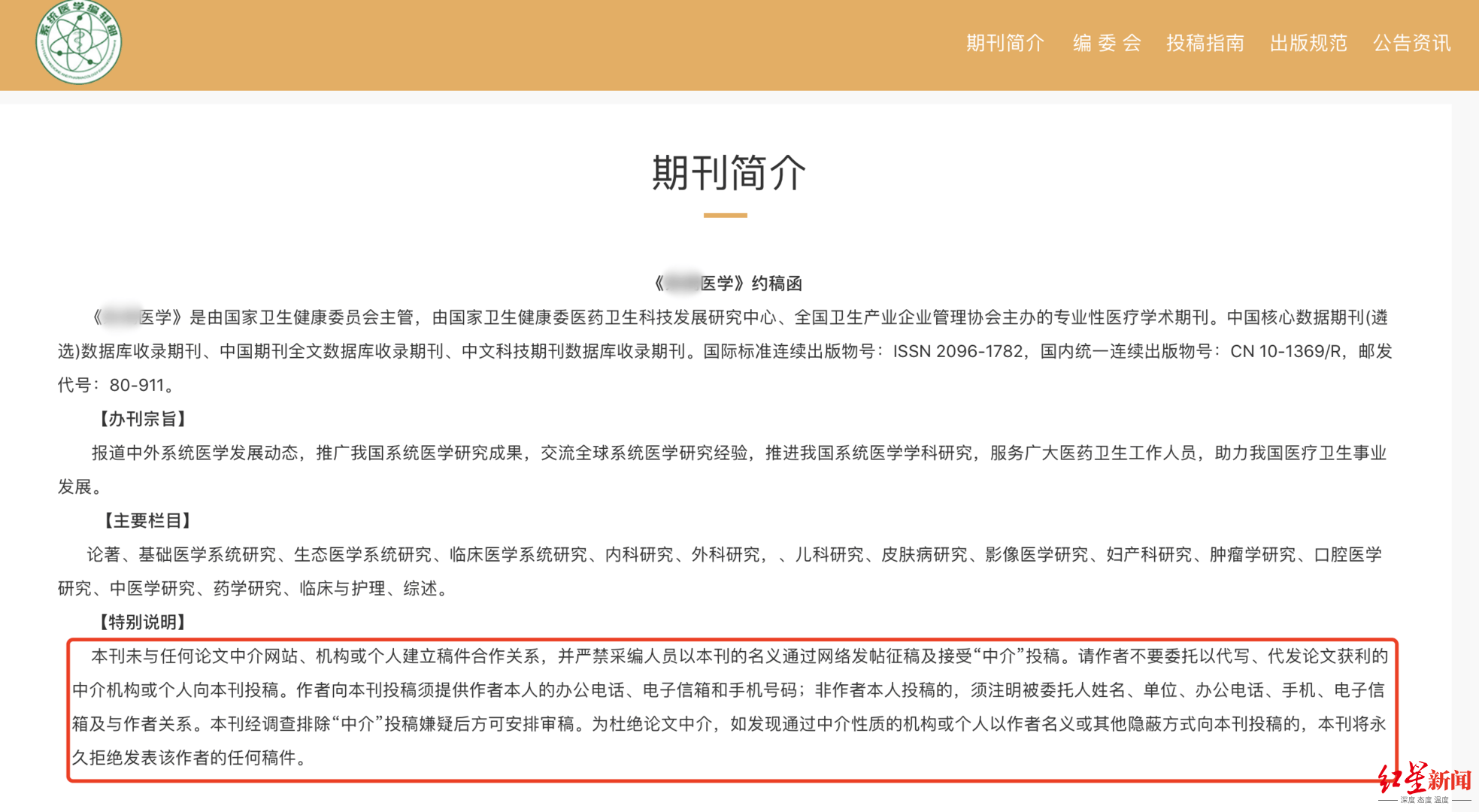 一家机构提供的内部资料显示,机构为帮客户刊发论文,能为客户凭空开具会议邀请函、参会证明等文件。这家机构负责人称,公司去年累计为客户运作发表论文13万篇,年收入超8000万元。 另一家中介机构的内部资料中登记了近110个所谓“合作期刊”名录,机构负责人表示,其中一些与机构“独家合作”的期刊,论文不经机构投稿就不会被录用。 “去年挣了8000万元” 自称运作18万篇论文成功发表13万篇 今年5月,红星新闻记者通过招聘,卧底进入两家论文代写代发中介机构,成为“学术期刊编辑”和“期刊发表顾问”。实质上,所谓的编辑、顾问只是销售的另一种称呼,其核心业务均为寻找有代写代发论文需求的客户。 “我们公司去年运作了大概18万篇论文,其中有13万篇成功发表,我们一年挣了8000万元。”在重庆数洞延玄文化传播有限公司面试时,该机构负责人向记者介绍称,公司客户大多来自有评职称需求的教师和医生群体,其中“医护客源占比在50%以上”。 ▲记者卧底的中介机构某员工记录下的近期收稿情况 该公司一名职员透露,公司一名“销冠”入行才一年多,每月能收到近600篇论文代写代发需求,按照一篇论文代投提成30元,“算上底薪每月收入能在2万元左右。”该职员鼓励记者:“只要你积累了一定的代理后,每个代理给你一些文章,一个月怎么也能收到100到200篇文章。” 代理是指直接对接论文发表需求客户的人员。一名销售在电脑表格中记录下自己近期工作情况:从今年3月到4月,该销售仅通过一名论文代理就获得超20篇论文运作,其中14篇涉及论文代写代发,17篇涉及医疗行业。 对于数洞延玄企业负责人所说的“一年运作发表13万篇论文”,则每月需运作发表10833篇。按该公司销冠每月最多收稿600篇、普通销售平均每月收稿200篇计算,要实现月发表万篇论文的目标,仅需约50名销售即可。而该负责人宣称,公司实际已有10支销售团队,记者所在的销售团队就有8人。 至于发表13万篇论文可赚8000万的说法,红星新闻记者看到,销售团队收一篇稿件均价普遍在2000元以上,经记者初步估算发现,该公司平均一篇稿件利润只需达到615元即可。 宣称有“独家发刊资源” 与期刊杂志社合作,非关系稿不会被录用 红星新闻记者卧底期间发现,该机构所谓的核心竞争力,在于其和各类期刊杂志社建立起的“独家发刊资源”——通过内部渠道为客户投递论文,在论文过审查发表环节开绿灯。 记者获取了一份该机构与一期刊合作的内部名单。名单显示,该机构可运作投稿的维普电子期刊超20个;另外还可以运作投稿9个收录于“知网会议”的学术会议电子刊。 该机构负责培训的人解释:“名单上有的期刊,就是我们有合作能帮客户投稿录用的。如果客户想投稿的期刊不在名单上就没法运作,那就争取给客户推荐名单上的期刊来替换。” 第二家名为“重庆中慧智科信息技术咨询服务有限公司”的中介机构则以“行业龙头”自居,自称只接医学类论文,且只做国家级期刊、核心期刊、SCI等级别的论文代投代写业务。红星新闻记者获取的该机构内部资料中,也详细登记了近110个自称能运作投稿的“合作期刊”名录,其中包含超50本核心期刊和超40本普通期刊。 该机构负责人提到,他们拥有的“独家合作”资源中,有一本长期合作的“独家代理”杂志名为《××医学》,系机构“关系稿”能快速审核发出:“别的论文机构都发不了,只有我们能帮客户发。”该机构负责人说,“所以即便买家拿着同一篇论文去投稿,不通过我们背后运作,这篇论文也不会被录用,因为不是‘渠道稿’就会被杂志社拒收。” ▲《××医学》杂志社官网《约稿函》截图 但该杂志官网公开的《约稿函》中明确:本刊未与任何论文中介网站、机构或个人建立稿件合作关系,严禁采编人员以本刊名义接受“中介”投稿。为了验证该负责人的说法,记者以买家身份询问其他论文中介能否代发《××医学》期刊,这些机构均称无法运作。 至于如何与期刊杂志社建立的合作关系,在记者卧底期间,该负责人非常谨慎,从未透露过,称系公司高级别商业秘密,不对外公开。机构工作人员告诉记者,因为销售和渠道建设是完全独立的两条线,拓展杂志社关系均由机构负责人进行,自己入职以来对此也一无所知。 红星新闻记者多次尝试致电《××医学》期刊杂志社,打公开电话始终无人接通。同时,记者也就此事联系上该杂志第二联合主办单位“全国卫生产业企业管理协会”,一名接线工作人员称:“我们已向《××医学》杂志社了解情况,这种情况不可能发生。” 会伪造论文录用通知 客户没参会也能开学术会议参会证明 论文机构利用建立起合作的期刊杂志社,不仅能为客户投稿,还能提供更多一条龙服务。 在第一家中介机构进行新人培训时,一名工作人员提到,为规避学术不端,部分单位明确要求,如有论文发表在学术会议期刊上,必须提交对应学术会议的邀请函、参会证明、所写论文在会议期间公开的“宣读证明”等。 “我们的客户即便没有参会,我们也能开出这些证明。”该机构负责培训的工作人员宣称,因机构与一些学术会议举办单位有合作,因此即便客户未参会,也可开具会议邀请函、论文在会上的“宣读证明”,并加盖会议举办单位公章。 ▲记者卧底的第一家中介机构内部培训资料截图 在该机构提供的内部培训材料中,红星