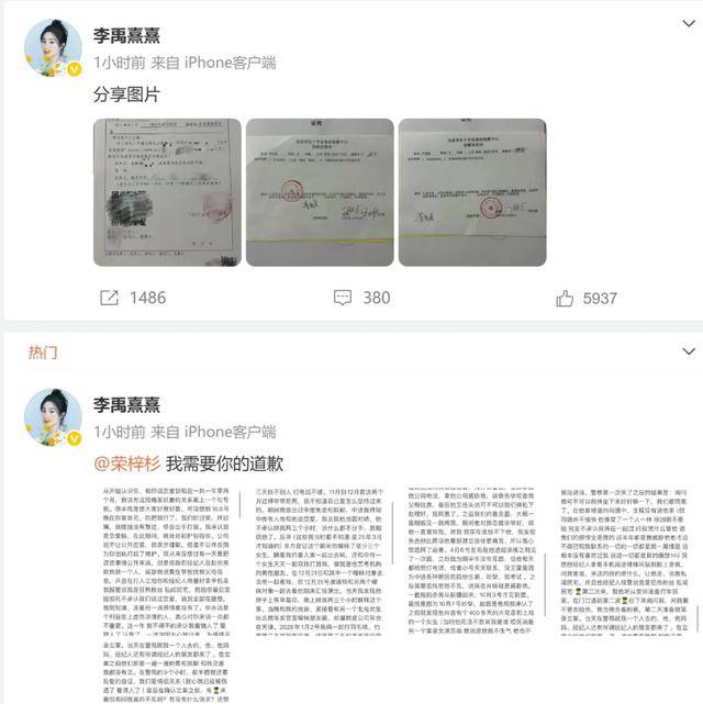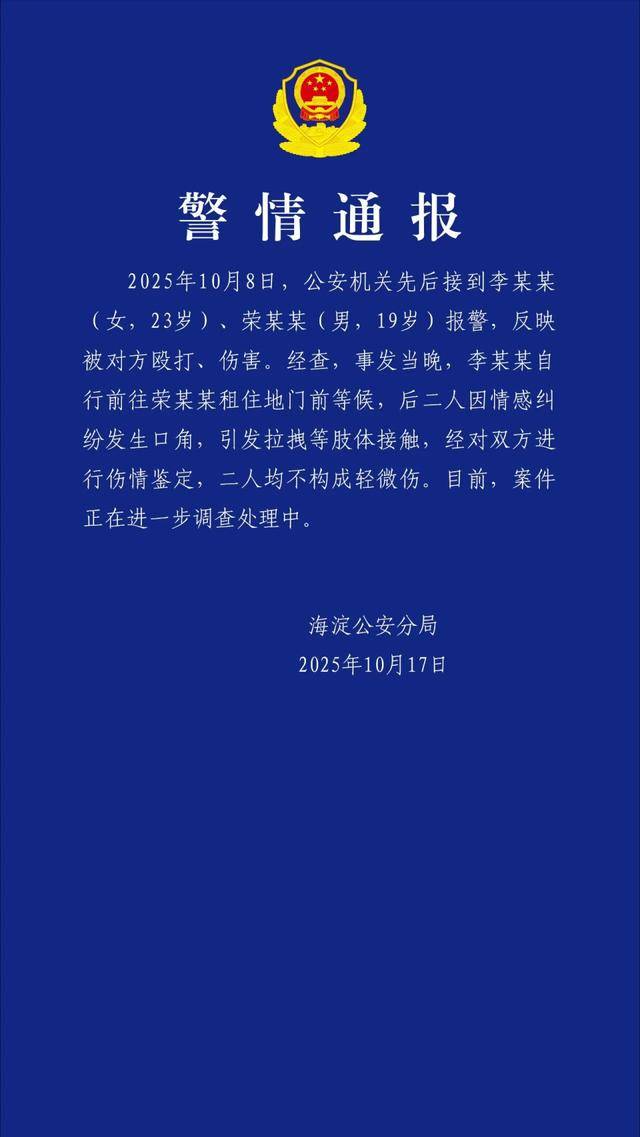 刚刚,北京市海淀公安分局发布通报: 2025年10月8日,公安机关先后接到李某某(女,23岁)、荣某某(男,19岁)报警,反映被对方殴打、伤害。经查,事发当晚,李某某自行前往荣某某租住地门前等候,后二人因情感纠纷发生口角,引发拉拽等肢体接触,经对双方进行伤情鉴定,二人均不构成轻微伤。目前,案件正在进一步调查处理中。 此前报道 15日深夜,多条消息显示今年刚从中央戏剧学院毕业的李禹熹发长文表示,自己于2024年8月与童星、同校师弟荣梓杉确立恋爱关系,但3个月后便遭遇对方不接电话、频繁失联的冷暴力。 从2025年3月到10月,李禹熹自陈陆续发现荣梓杉至少与3名女性暧昧(包括中传、北电女生),她因长期精神折磨确诊中度焦虑和抑郁,但因舍不得这段感情以及对方的保证,而未能分手。 李禹熹 荣梓杉 李禹熹提到,10月7日,两人再次因为荣梓杉与某上戏女生的关系发生争吵。10月8日,她前往荣梓杉家中“想要好好聊聊”时,被对方“二话没说就给我拎住摔倒在地,摔了我两次,我头和肩直接磕地上……进门前还踹了我一脚”。李禹熹随后在微博出示立案告知书以及诊断书,诊断书显示,其身体受到多处损伤。 李禹熹还提到,被打后她选择报警,面对警察追问,荣梓杉否认两人是情侣关系,此时出现的荣梓杉经纪人更将她定性为“狂热粉丝”,是“私闯民宅”。李禹熹透露,10月12号自己前往法医伤情鉴定场所时发现荣梓杉也在:“他也去了,他说我俩是互殴。”李禹熹表示,自己发文是要求荣梓杉道歉。 至截稿时止,荣梓杉并未在微博回应此事,他最后一条微博发布的时间,正好停留在10月8日。同时,其工作室账号“荣梓杉的工作室”也未发声。 荣梓杉出生于2006年,今年才19岁。2020年,他凭借《隐秘的角落》中朱朝阳一角一举成名。 2024年,中戏、北电两所学校成绩公布,荣梓杉获得这两所学校表演专业第一名的好成绩,当年,荣梓杉被中央戏剧学院录取。 来源:北京市海淀公安分局 极目新闻 |