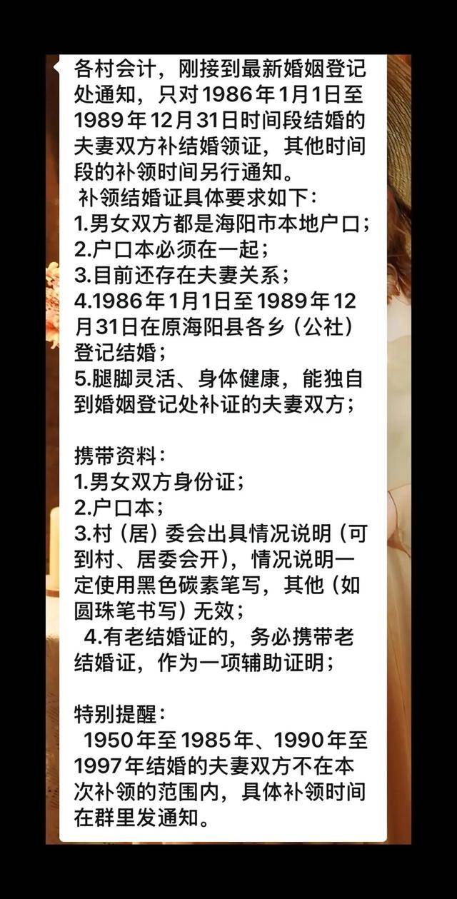 近日,多名网友反映,山东省烟台市海阳市不少老人前往婚姻登记处补领结婚证。10月18日,#民政局回应老人扎堆领结婚证#冲上热搜。 网友发布的视频中,墙壁上挂着“海阳市民政局婚姻登记处”牌子,现场有不少老人。 多名视频拍摄者均称,现场系在补办结婚证。 有网友在评论区晒出一微信群通知信息:“补办结婚证的90年以前(不含90年)到村里开介绍信到镇政府。如有档案可到婚姻登记处直接补办,没有档案回到镇民政办开证明,夫妻双方携带证件到婚姻登记处办理。” 另一网友在评论区晒出微信区截图显示,接婚姻登记处通知,只对1986年1月1日至1989年12月31日时间段结婚的夫妻双方补领结婚证,其他时间段的补领时间另行通知。 补领结婚证的要求为:双方都是海阳市本地户口;户口本必须在一起;还存在夫妻关系;1986年1月1日至1989年12月31日在原海阳县各乡(公社)登记结婚;腿脚灵活、身体健康,能独自到婚姻登记处补领的夫妻双方。 村里包车统一去办理 10月17日,记者联系到一位知情人士。他表示,10月14日,他们村的村委会称,接到了民政局的通知,让1950年5月1日至1997年9月1日区间的结婚登记人员补办结婚证,“此后某天,我们村统一包车,统一去办理。” 他说,村里老人接到通知后就会按要求去办理,“有些人以前都登记结婚,结婚证遗失了,所以补办一下。有的是补领结婚证。” 对此,他提供了群内的通知信息截图,内容与某网友在网上晒出的通知信息一致。 根据其提供的通知信息显示,有人通知说,“明天民政维护系统,各村都通知一下,让大家不要白跑一趟,具体办理时间等通知。” 民政局回应老人领结婚证 10月17日,记者联系到海阳市民政局婚姻登记处,工作人员表示不接受对此事的采访,建议联系海阳市委宣传部。 海阳市民政局工作人员表示,具体情况他们会向领导汇报,届时回应。 烟台市民政局相关科室工作人员说,老人补领结婚证,是因为一些老人的结婚登记信息系统内没有,而其当年的结婚证明也已遗失,因此需要补领结婚证。早年没有结婚登记,但有相关证明,也相当于补领。 该工作人员进一步解释道,一些年龄比较大的老人,以前的证明等是纸质的,而婚姻登记系统内早年的婚姻登记信息不全,因此需要老人重新补领。如果系统内没有老人的婚姻登记信息,在补领结婚登记的同时,也就将信息进行了补录。 来源:华商报 |