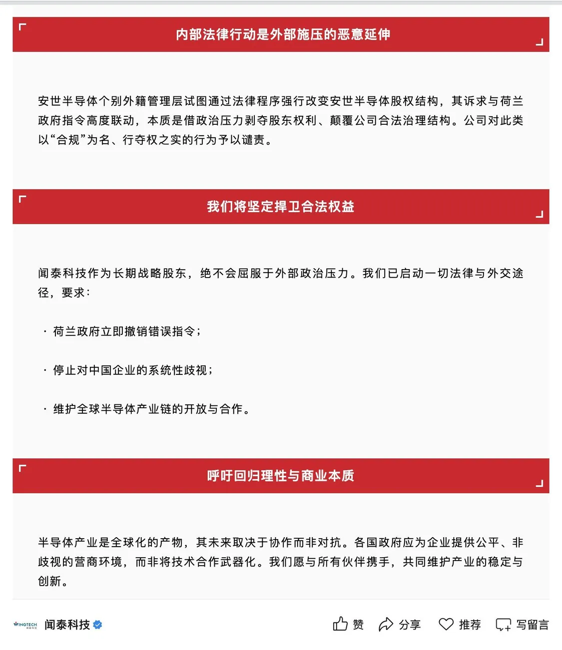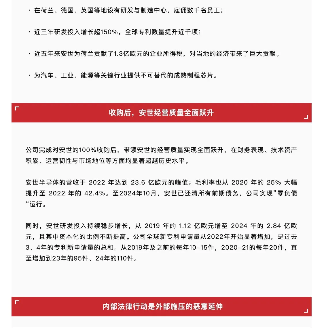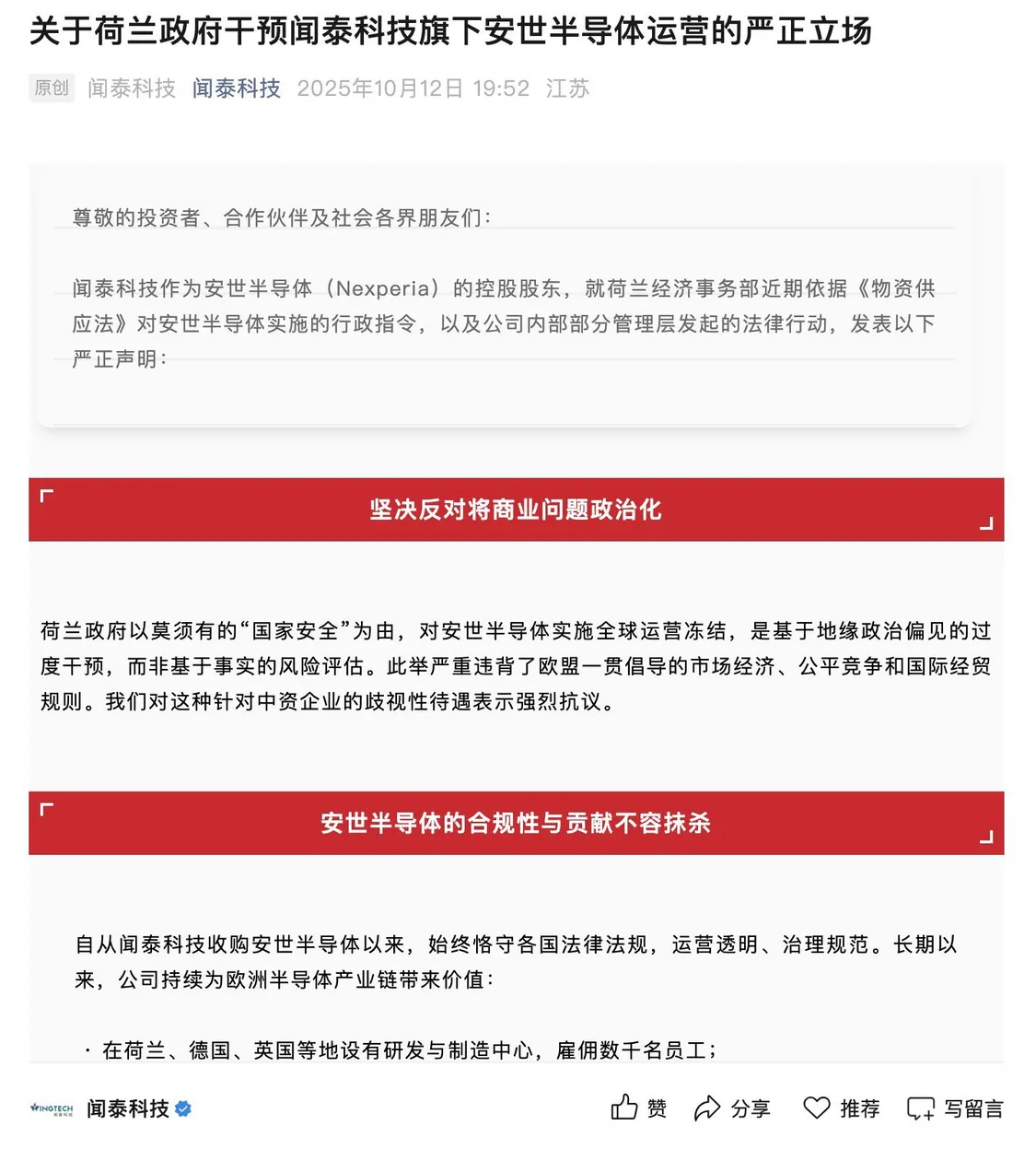 一则突如其来的公告,将半导体与产品集成巨头闻泰科技推上了风口浪尖。 10月12日晚间,闻泰科技发布公告披露,公司旗下贡献百亿元营收的核心半导体资产——安世半导体(Nexperia),突遭荷兰政府与法院的双重限制。荷兰经济事务与气候政策部下达部长令,要求安世半导体及其全球30个主体对其资产、知识产权、业务及人员等进行为期一年的“冻结”,不得进行任何调整。 紧随其后,荷兰当地法院应安世半导体三位外籍高管的紧急请求,裁决暂停闻泰科技创始人、董事长张学政在安世半导体的董事职务,并任命一名拥有“决定性投票权”的独立董事,同时将闻泰科技方面持有的几乎全部股权交由第三方管理。 安世半导体作为全球领先的分立与功率芯片IDM(垂直整合制造)龙头厂商,是闻泰科技最重要的利润来源和业务核心。财报显示,仅2024年,半导体业务便为公司贡献了147.15亿元的营业收入和22.97亿元的净利润。 当日晚间,闻泰科技方面向《每日经济新闻》表示,闻泰科技作为安世半导体的合法股东,坚决反对这种不公正的待遇。公司将运用一切合法合规的手段,坚定不移地维护自身股东权利和公司利益。相信公正的法律和市场规则终将得到伸张,当前不合理的干预是无法持久的。 此外,闻泰科技方面呼吁各方应尊重商业规律和全球半导体产业的共生关系,停止将企业作为地缘政治博弈的棋子。一个碎片化、政治化的全球供应链,最终将损害所有参与者的利益。 |