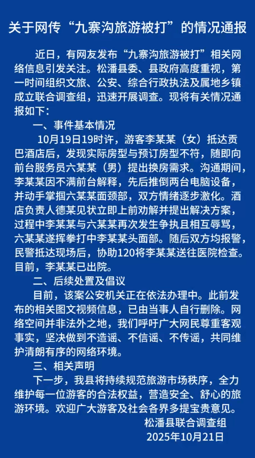 10月22日,“微松潘”发布关于网传“九寨沟旅游被打”的情况通报。 近日,有网友发布“九寨沟旅游被打”相关网络信息引发关注。松潘县委、县政府高度重视,第一时间组织文旅、公安、综合行政执法及属地乡镇成立联合调查组,迅速开展调查。现将有关情况通报如下: 10月19日19时许,游客李某某(女)抵达贡巴酒店后,发现实际房型与预订房型不符,随即向前台服务员六某某(男)提出换房需求。沟通期间,李某某因不满前台解释,先后推倒两台电脑设备,并动手掌掴六某某面颈部,双方情绪逐步激化。酒店负责人德某见状立即上前劝解并提出解决方案,过程中李某某与六某某再次发生争执且相互辱骂,六某某遂挥拳打中李某某头面部。随后双方均报警民警抵达现场后,协助120将李某某送往医院检查。目前,李某某已出院。 目前,该案公安机关正在依法办理中。此前发布的相关图文视频信息,已由当事人自行删除。网络空间并非法外之地,我们呼吁广大网民尊重客观事实,坚决做到不造谣、不信谣、不传谣,共同维护清朗有序的网络环境。 |