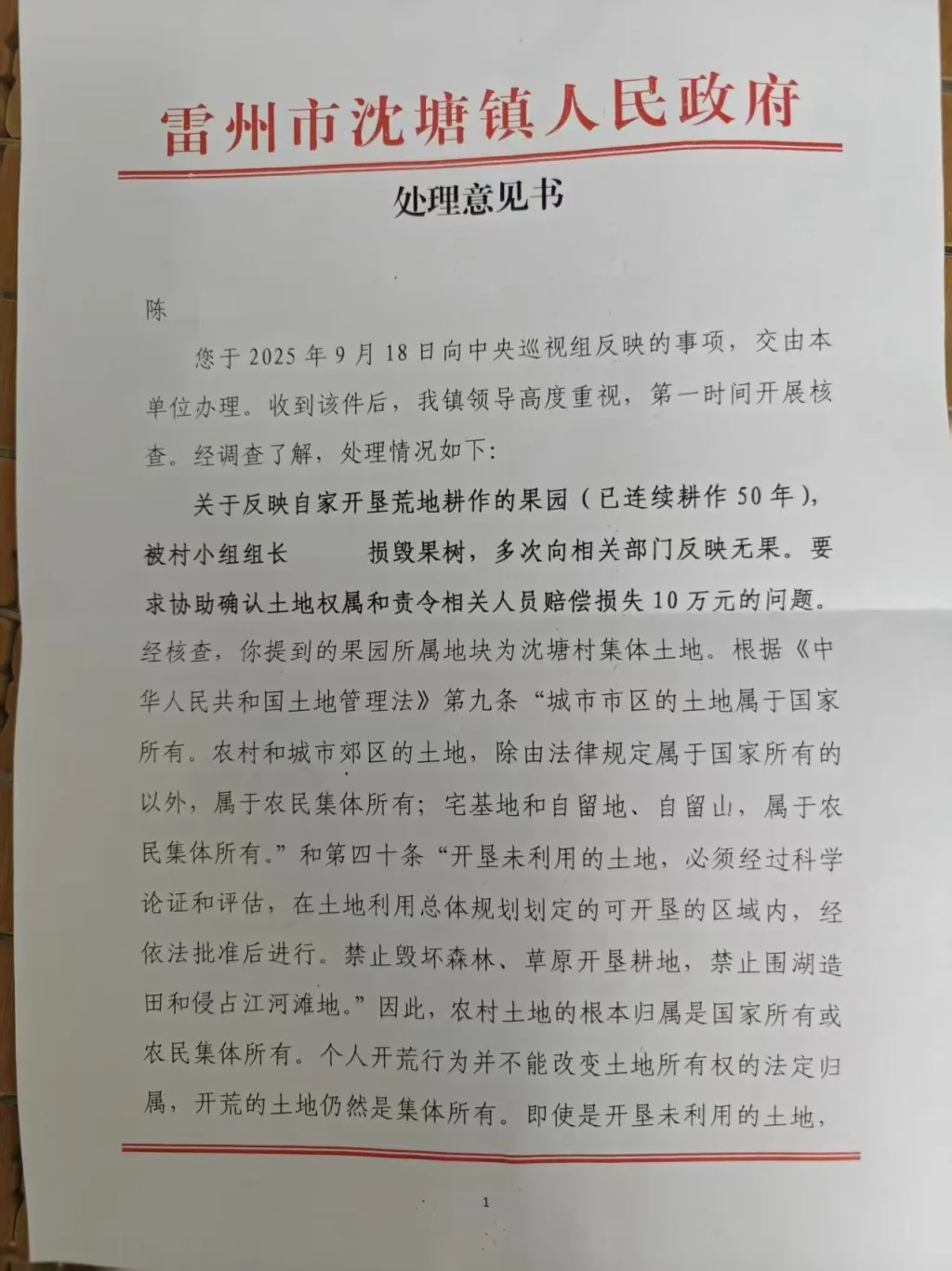 近日,广东湛江市雷州市沈塘镇沈塘村的陈女士向澎湃新闻反映称,今年8月,疑因防蚊,自家种了30多年的20棵菠萝蜜树被村委会安排的挖掘机毁掉。就此事,村干部此前称可以补偿,但补偿一事拖了两个月,至今没有结果。 今年8月,陈女士一家的20棵菠萝蜜树遭挖机清理 本文图均为受访者供图 10月28日,沈塘村委会相关负责人回应澎湃新闻称,此前,确实跟陈女士的父亲交涉过,表示村民小组可以给予一定补偿。但菠萝蜜树被清理的第二天,陈女士一方就立即报警,把事情弄得“复杂”了。目前,村里也愿意协商,因陈女士的父亲提出赔偿10万元,暂未能协商一致。 对此,陈女士回应称,因此事,他们多次找过村里,也愿意协商,但村里一直“不理会”。 澎湃新闻注意到,此前,雷州市沈塘镇政府作出的《处理意见书》显示,在清理果树前,沈塘村干部已提前与陈女士的父亲沟通过,表示可以协调沈塘村民小组补偿果树损失,但该地块使用权要归还村集体。 村民:20棵菠萝蜜树疑因防蚊被清理 据陈女士介绍,其父亲名叫陈保荣,今年70多岁,自上世纪70年代开始种果树。上世纪90年代,当时政策鼓励开荒,于是父亲在沈塘圩开荒约0.7亩的土地,种下了21棵菠萝蜜树,后枯死1棵存活20棵。经过30余年的生长,这20棵菠萝蜜树长得很大了,丰收好时,一年有1万多元的收入,这笔收入曾是家里重要的经济来源。 陈女士称,今年8月12日晚,有村干部跟父亲说,可能要征用这块果园,需要砍掉果树,父亲跟对方说,可以砍掉果树,但要赔偿损失,对方没有就此作出表态。8月13日一早,在没有任何通知的情况下,挖掘机直接开进果园,毁掉了20棵菠萝蜜树。 “当时树上的果还没成熟,还有很多果。”陈女士说。 陈女士表示,因事发突然,为了保留固定证据,他们选择了报警。后面,他们找村干部了解情况,对方说是“为了防蚊”,至于赔偿问题,就是不回应、消极对待,或者让等待。 陈女士称,据其所知,当地并没有基孔肯雅热以及登革热病例,疫情防控形势不是很紧张。果园距离住宅区有一定距离,且果树被砍后,地上长满了杂草,都没有人清理。此外,当地没有其他人的果树被砍的类似事件。事后,他们听说,是有人看上了这块土地,想搞其他项目。 镇政府:村干部已提前沟通过,表示可补偿果树损失 因赔偿问题一直没有着落,陈女士及其家人向多部门反映情况。 10月14日,雷州市沈塘镇政府作出的《处理意见书》显示,经核查,陈女士一方提到的果园所属地块为沈塘村集体土地。根据相关法律规定,个人开荒行为并不能改变土地所有权的法定归属,开荒的土地仍然是集体所有。即使是开垦未利用的土地,也必须经过依法批准。目前,陈女士一方暂无法提供相关开荒批准文件。 《处理意见书》称,根据湛江市委“万村清洁”行动以及基孔肯雅热、登革热等蚊媒疫情防控工作需要。沈塘镇辖区全面开展相关整治工作,镇政府决定需要对沈塘镇沈塘村极易孳生蚊虫重点隐患地方进行全面清理。沈塘村干部已提前与陈保荣沟通过,表示可以协调沈塘村民小组补偿果树损失,但该地块使用权要归还村集体。8月13日沈塘镇沈塘村委会驻点领导带队,组织驻点干部、村干部对该地进行清理。 《处理意见书》还表示,目前,该案件公安机关正在办理中,镇、村两级将进一步进行协调处理此事;或者陈女士一方可以另外提交材料向法院提起诉讼。 10月17日,针对陈女士一方的反映,12345政务平台也给出了相似的答复。