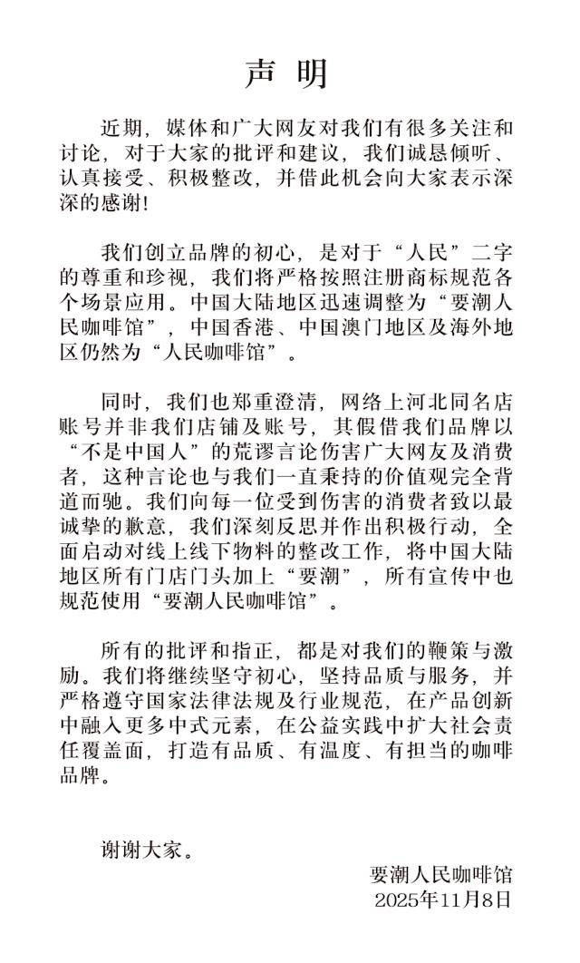 极目新闻记者 杜光然 近期,全国多地出现了以“人民咖啡馆”为店标、且装修高度相似的门店,成为网络打卡新地标。据悉,“人民咖啡馆”母公司为要潮(上海)文化传播有限公司,以“人民”名义四处销售商品的,却只是一家市场化运作的公司。 对此,人民网评论称,“人民”一词具有鲜明的公共属性和深厚的政治内涵,承载着特定的社会情感与公共利益,不容亵渎,更不能被滥用。要潮文化公司多次申请“人民咖啡馆”商标被驳回,相关部门已经就此亮明了态度。这家企业拿着“潮人民咖啡馆”“要潮人民咖啡馆”的注册商标,混淆视听地经营“人民咖啡馆”,无疑是对法律法规和公众情感的不尊重。 11月7日晚,极目新闻记者来到“人民咖啡馆”首店——上海四行仓库店,这里也是要潮(上海)文化传播有限公司的注册地址。记者准备下单时,被告知饮品和文创暂时没有了,门店后续要进行调整。 11月7日晚,“人民咖啡馆”上海四行仓库店 8日上午,记者注意到,“人民咖啡馆”认证账号已改名“要潮人民咖啡馆”,官方账号还发布声明:“我们创立品牌的初心,是对于‘人民’二字的尊重和珍视,我们将严格按照注册商标规范各个场景应用。中国大陆地区迅速调整为‘要潮人民咖啡馆’,中国香港、中国澳门地区及海外地区仍然为‘人民咖啡馆’。”