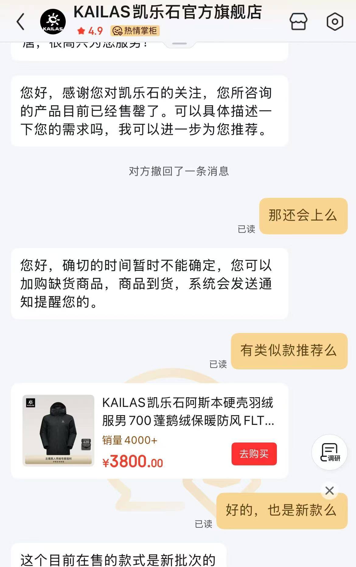 引发争议的产品是,凯乐石已在网店下架的“喀纳斯”羽绒服与新推出的“阿尔塔”羽绒服。有消费者反映,两款产品从外观设计到核心面料、充绒量等关键参数均高度相似,产品信息显示大身鹅绒都是绒子含量90%,面料均是2L GORE-TEX ePE,喀纳斯售价3900元,阿尔塔售价4800元。网上该热议话题下,有网友评论称,其11月买了喀纳斯,尺码大了换没货,直播间说12月要涨价,然后12月基本无喀纳斯,换名4800了。还有网友晒出客服对话截图,回复两款的功能是一致的,暂时没有具体区别的。 据极目新闻记者实地探访凯乐石线下门店,被指“换名涨价”的“阿尔塔”羽绒服在武汉门店暂时无货,在售的“喀纳斯”款羽绒服售价3900元,与线上官方旗舰店定价保持一致。 12月26日,界面新闻记者查询凯乐石在两个电商平台的官方旗舰店,搜索“阿尔塔”显示无相关产品信息,店铺客服回应称:该产品目前已经售罄,后续是否还会上架暂时没有收到通知。客服并表示类似设计的款暂时没有,如果选硬壳羽绒服款推荐在售的阿斯本硬壳羽绒服男700蓬鹅绒保暖防风款,售价3800元,两个平台该款销量分别是3000+和4000+。