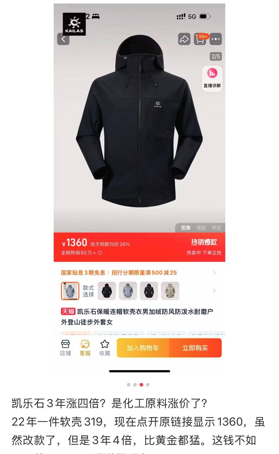 凯乐石成立于2003年,总部位于中国广州,以中国山峰冈仁波齐(Mt.KAILASH)为名创立,围绕 “攀登” 开发了登山、攀岩和越野跑山三个主要产品系列,2020年起从“高性价”向高端专业品牌转型。 当前户外市场规模持续扩容,2025年预计突破1600亿元。近年来,凯乐石品牌发展迅速,今年双十一大促已经进入天猫户外成交榜前五名,排名高于始祖鸟、加拿大鹅等品牌。不过,也有不少消费者在网上吐槽近几年品牌涨价太快,有一位网友在网上晒出他2022年购买一件凯乐石保暖连帽软壳衣的信息,花了319元,现在点开原链接显示售价1360元,感慨“3年涨价4倍,是化工原料涨价了”?